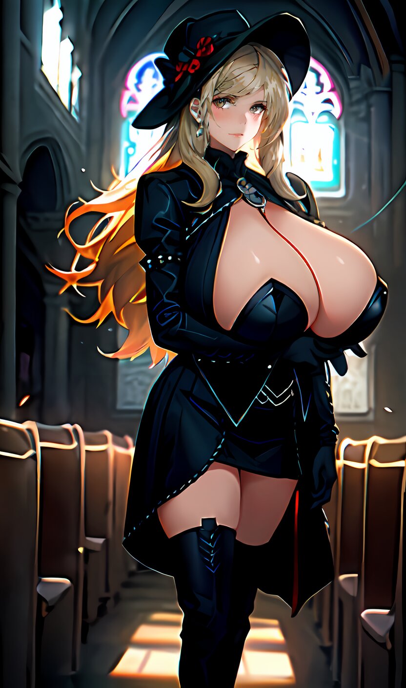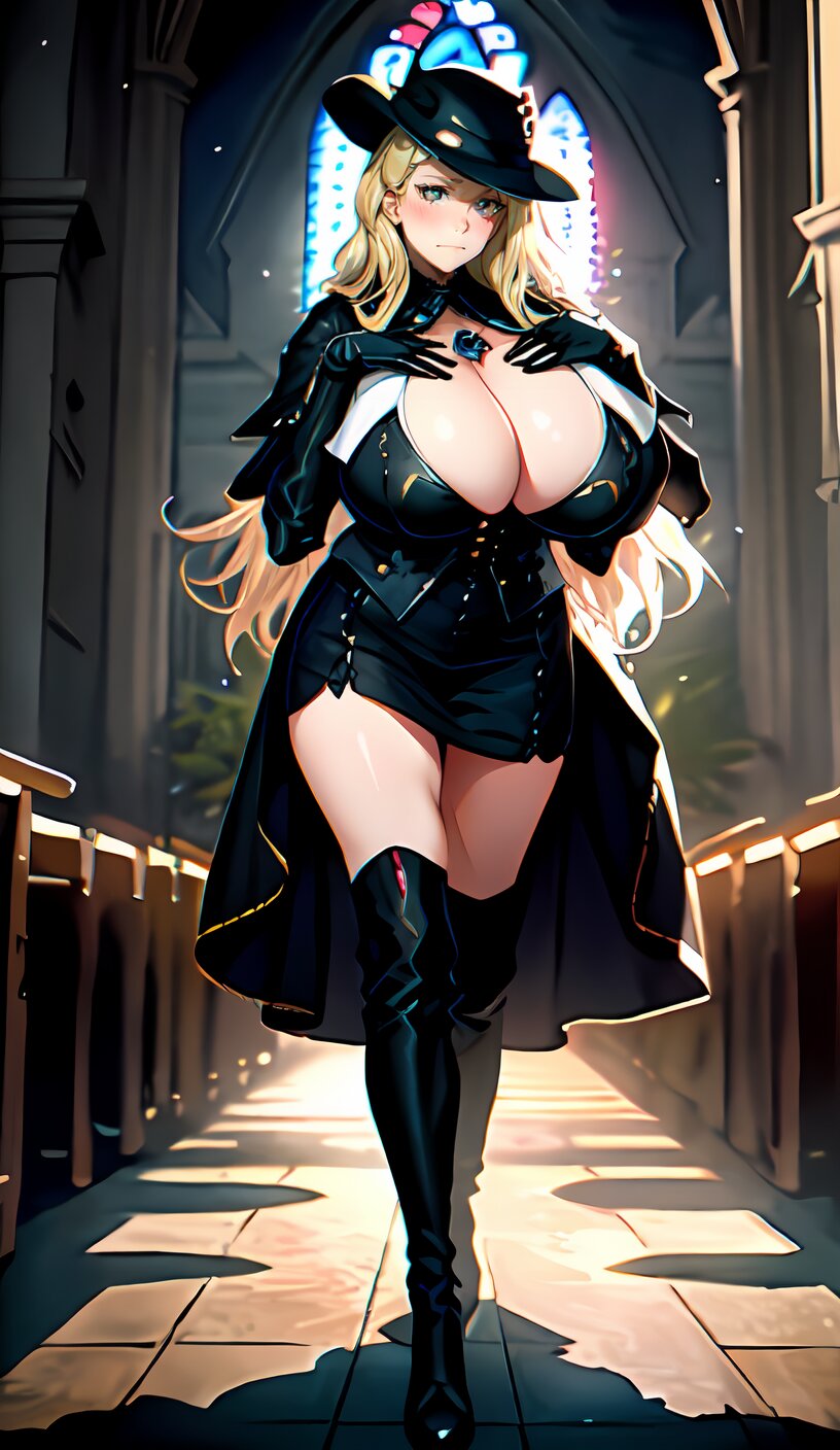 full body, (photorealistic:1.4), (More light, Light from the feet:1.2), SIGMA lens, 85mm f/1.4., 1/500 sec shutter, ISO 100, Studio photography, live-action, HDR, photo, perfect anatomy, best quality, ultra-detailed, extremely detailed, caustics, masterpiece, hyperrealistic, very_high_resolution, full color, (NaturalHand2-3500:1), ethereal lighting, random pose, random angle, 1girl, 24years old, (widow, blond hair, Widow Hat, vail: 1.4), thigh boots, hips out, white gloves, necklace, hair bow, (huge breast: 1.8), bust, jewelry,{{skirt lift}}, (at the funeral in church: 1.4), <lora:Charlotte_02:1>