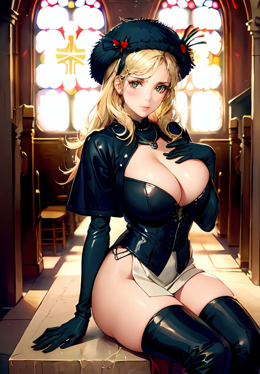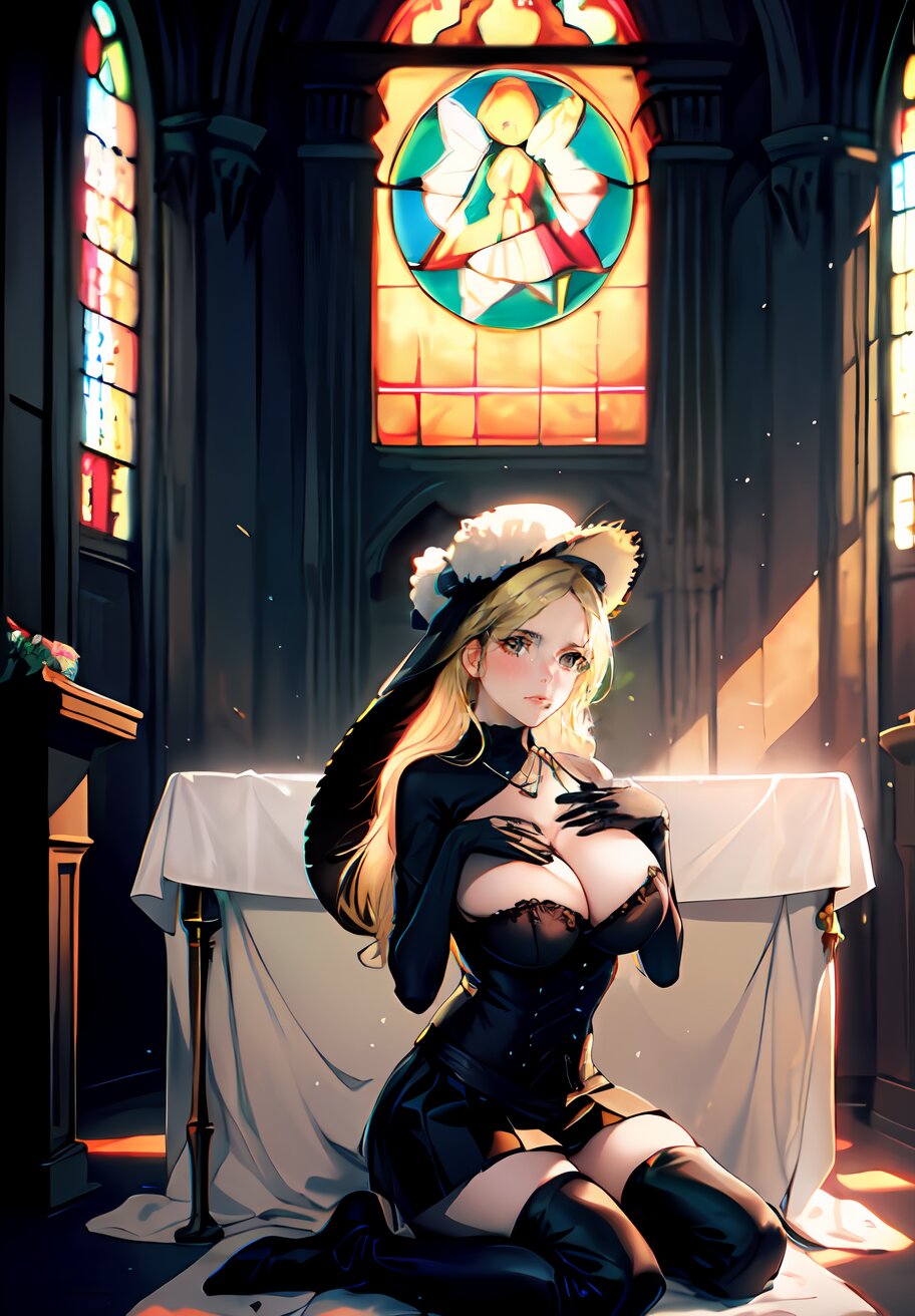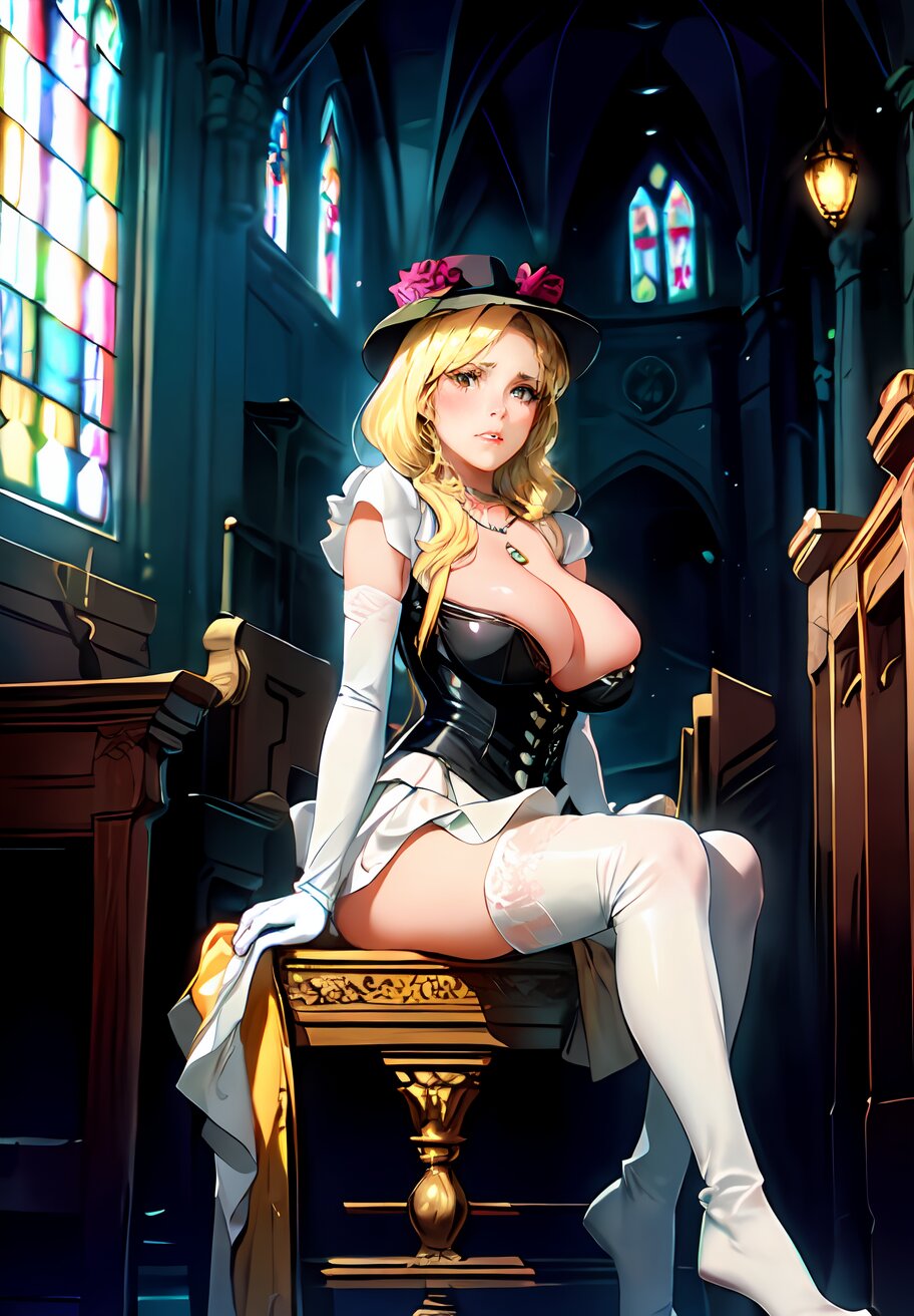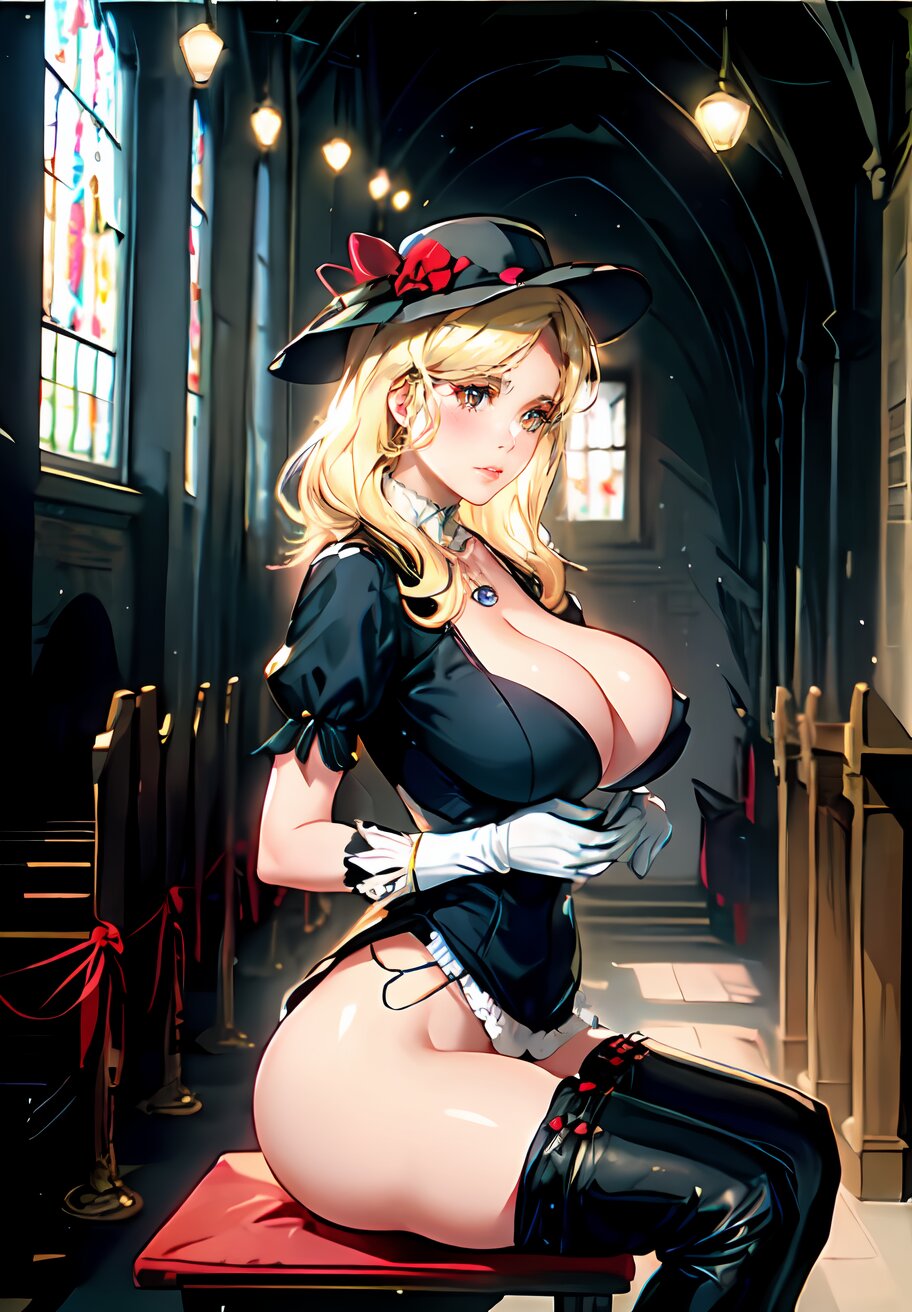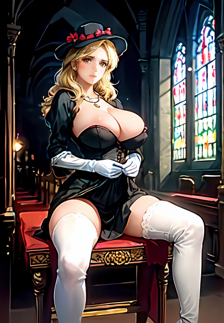 full body, (photorealistic:1.4), (More light, Light from the feet:1.2), SIGMA lens, 85mm f/1.4., 1/500 sec shutter, ISO 100, Studio photography, live-action, HDR, photo, perfect anatomy, best quality, ultra-detailed, extremely detailed, caustics, masterpiece, hyperrealistic, very_high_resolution, full color, (NaturalHand2-3500:1), ethereal lighting, random pose, random angle, 1girl, 24years old, (widow, blond hair, Widow Hat: 1.4), thigh boots, hips out, white gloves, necklace, hair bow, (huge breast, beautiful nipple: 1.2), bust, jewelry,{{skirt lift}}, {{undressing}}, (sitting on altar in church: 1.4), <lora:Charlotte_02:0.6>