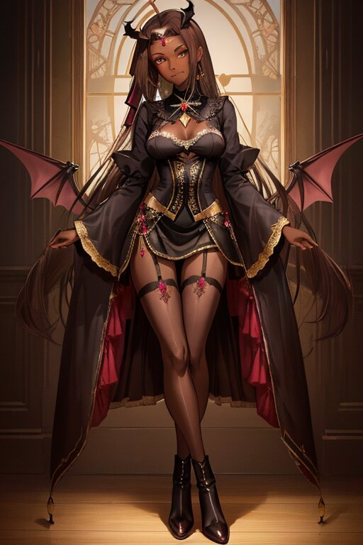 Anime Style Full-body portrait. ■ Appearance - Age: Female, Mid-20s - Non-Human Features: (Single unicorn-like horn: 1.0) (Center of forehead: 1.4) (Straight) (Large: 1.2) (Thickness: 4cm) (Light brown) (No other horns: 1.3), (Bat-like wings on back: 1.3) - Eyes: Black with light brown pupils. - Lips: (Thickness: 1.3) Blood-red lips. - Hairstyle: Black hair, waist-length ponytail, center-parted bangs. - Skin: (Smooth, shiny dark brown skin: 1.4) - Breasts: Largest breasts. - Atmosphere: A cool and beautiful secretary. Always smiling in front of her master. Her skin is smooth, shiny dark brown, and glows warmly under dramatic lighting. ■ Outfit - Tops: Luxurious women's butler outfit (dark brown, gold embroidery, sequins), ribbon tie, ruffled blouse. - Bottoms: (Long skirt covering the legs: 1.4) (Side slit) (High-low skirt), (Miniskirts not allowed: 1.3). - Underwear: Red high-leg string shorts (side ribbon), (Center part hidden by skirt). - Legs: Metallic fishnet stockings, garter belt. - Accessories: Gold cufflinks (with raspberry-colored jewels). - Shoes: Black long boots (with silver lace). - Favorite colors: Brown, black. Dramatic lighting, contrast, rim light that flatters the skin, subtle textures, and full-body flattering effects.