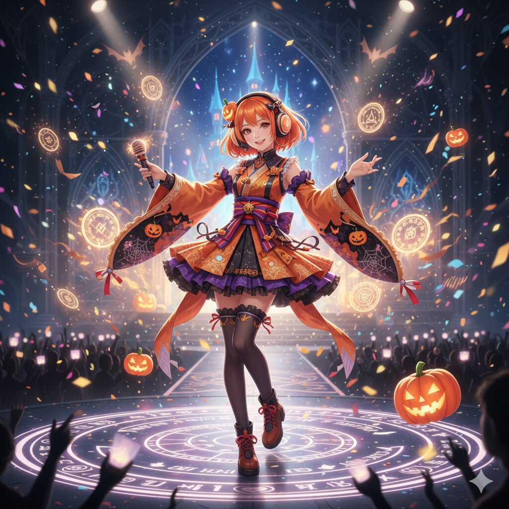 🎃 Zena — Magic Academy Halloween Festival Performance > Ultra-detailed cinematic portrait of Zena, a Japanese cyber-pop idol student with vivid orange bob hair shining like a lantern flame and her signature sleek orange headphones glowing softly with magical runes. She is performing on stage at the Magic Academy’s Halloween Festival, surrounded by floating magic sigils, glowing pumpkins, and luminous confetti of enchanted light. Zena is wearing a Halloween-themed stage outfit based on a modern idol style fused with delicate traditional Japanese design. Her costume features an obi-style ribbon at the waist, slightly kimono-inspired sleeves, and a layered mini-skirt with hakama-style pleats that sway as she moves. The outfit sparkles with pumpkin and candy motifs, spiderweb lace, and tiny bat ornaments, blending Halloween fantasy with futuristic idol charm. The color palette is orange, black, and purple, with accents of red and white adding depth and contrast. Her Jack-o’-lantern hair charm gleams under the dramatic stage lighting, while the glossy satin and matte fabrics of her outfit shimmer with ethereal beauty. Behind her, the magic circle beneath the stage glows with intricate light patterns, casting a mystical aura across the scene. Zena poses confidently, her eyes bright with excitement, embodying both elegance and Halloween magic — the perfect fusion of idol energy, cyber style, and enchanted tradition.
