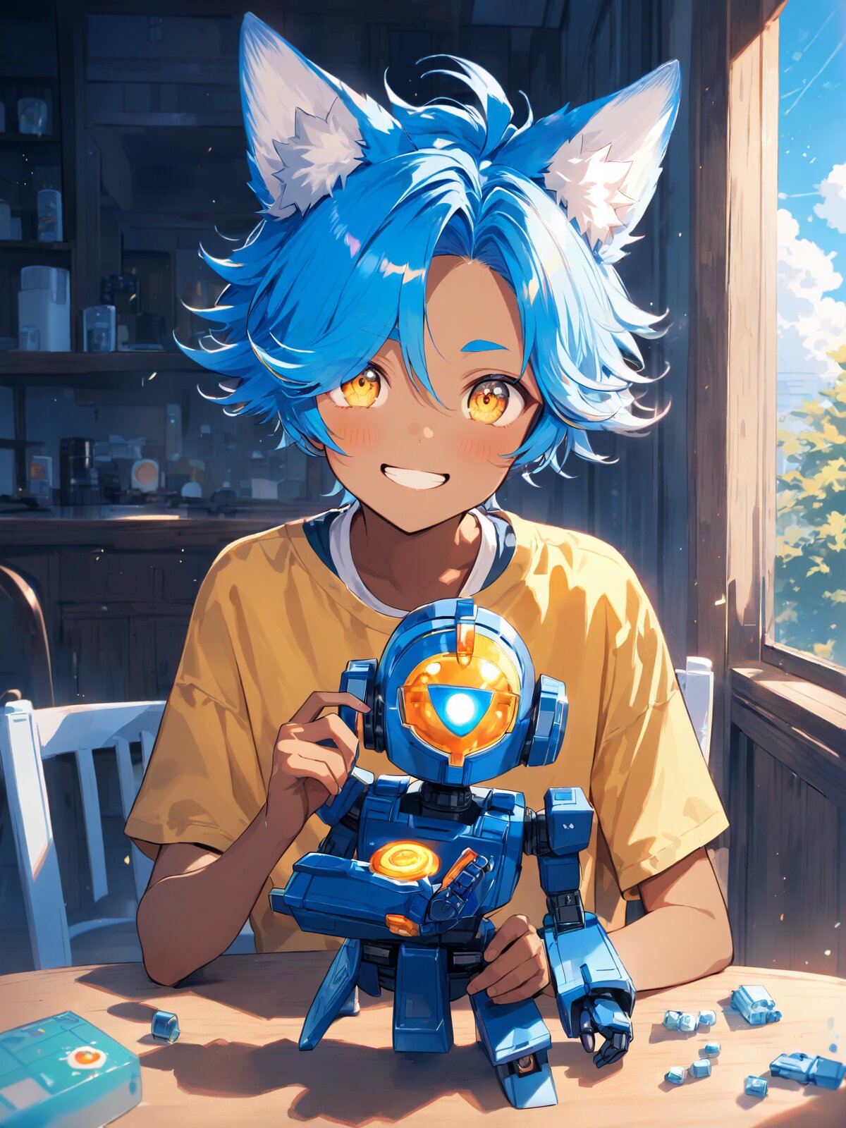 male focus, boy, shota, fox ears, golden amber eyes, bright sky blue hair, tan skin, hair over one eye, short flipped hair, grin, creating plastic model robot, cool plastic model robot, cowboy shot, table, chair, happy, casual fashion
