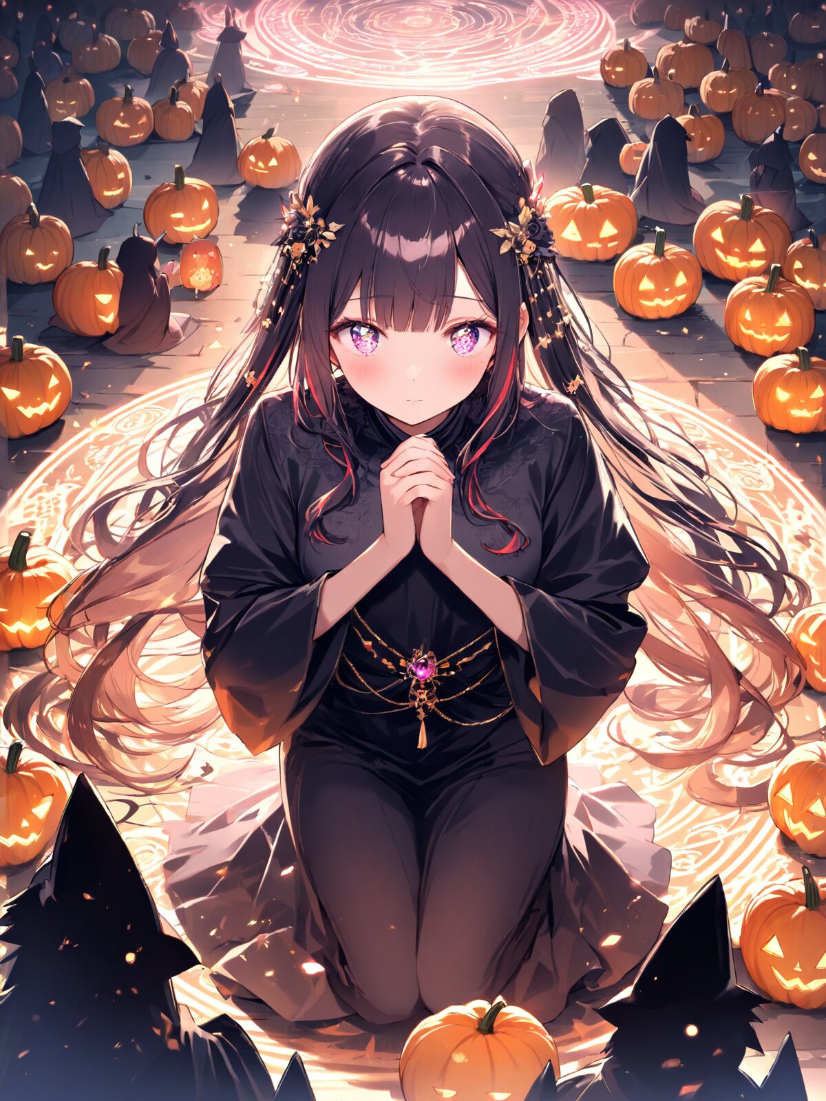 ceremony, magic circle on the ground, many people praying, Halloween, pumpkins
