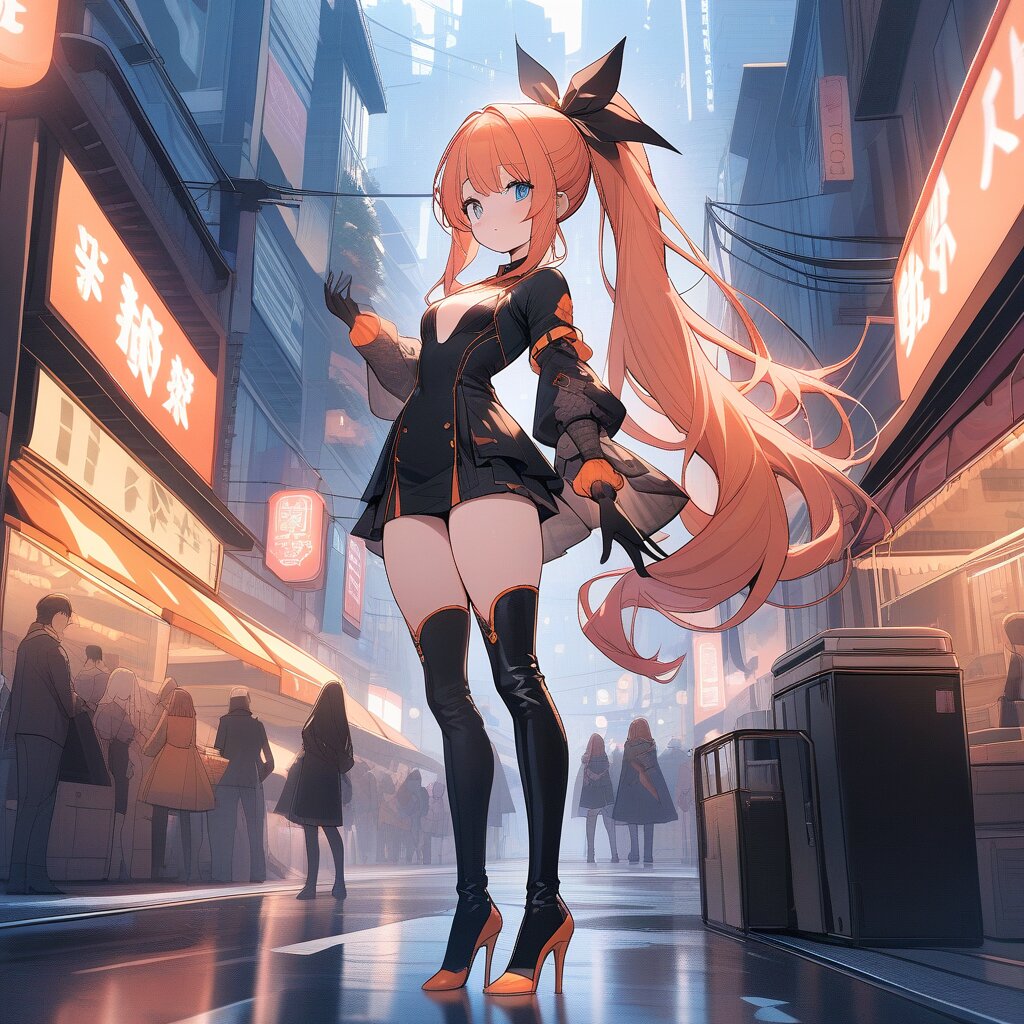 best quality,absurdres,8k,ultra detailed,very aesthetic,1girl,(rating: general:1.2), long hair, blue eyes, very long hair, hair ribbon, ponytail, orange hair, high ponytail, scenery, city, bewitching thighs, boots, thigh boots, high heel boots, knee boots, high heels, footwear, whole body, full body, perfect body, entire body, perfect anatomy, perfect chest, perfect arms, perfect hands, perfect hips, perfect legs, small breasts,