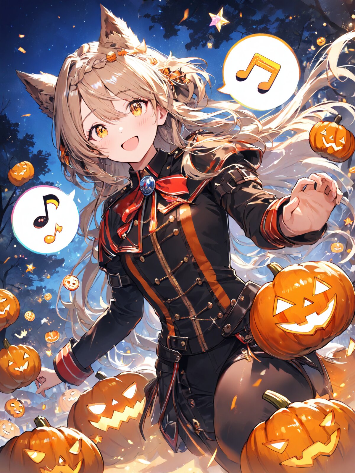 night, happy, dynamic angle, dynamic action, magic academy, male focus, golden amber eyes, wolf man, Halloween, pumpkin, smile, speech bubble, quarter note