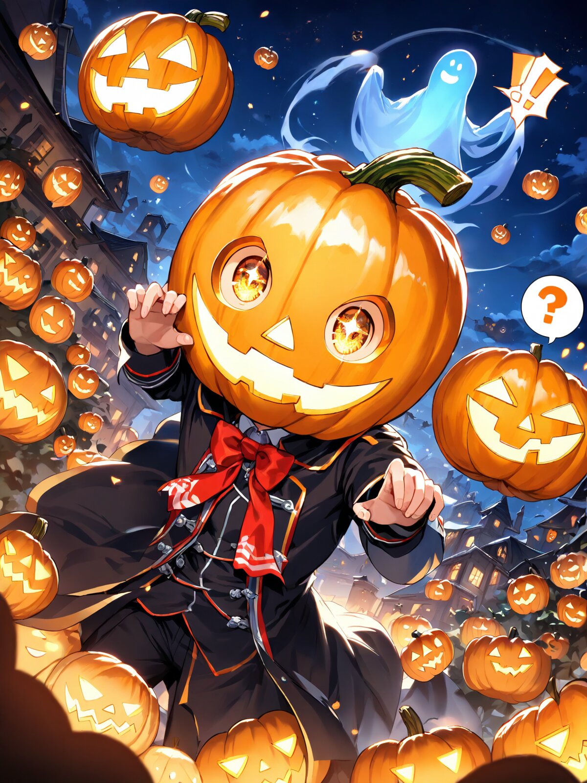 night, happy, dynamic angle, dynamic action, magic academy, male focus, golden amber eyes, ghost man, Halloween, pumpkin, smile, speech bubble, exclamation mark, surprise,