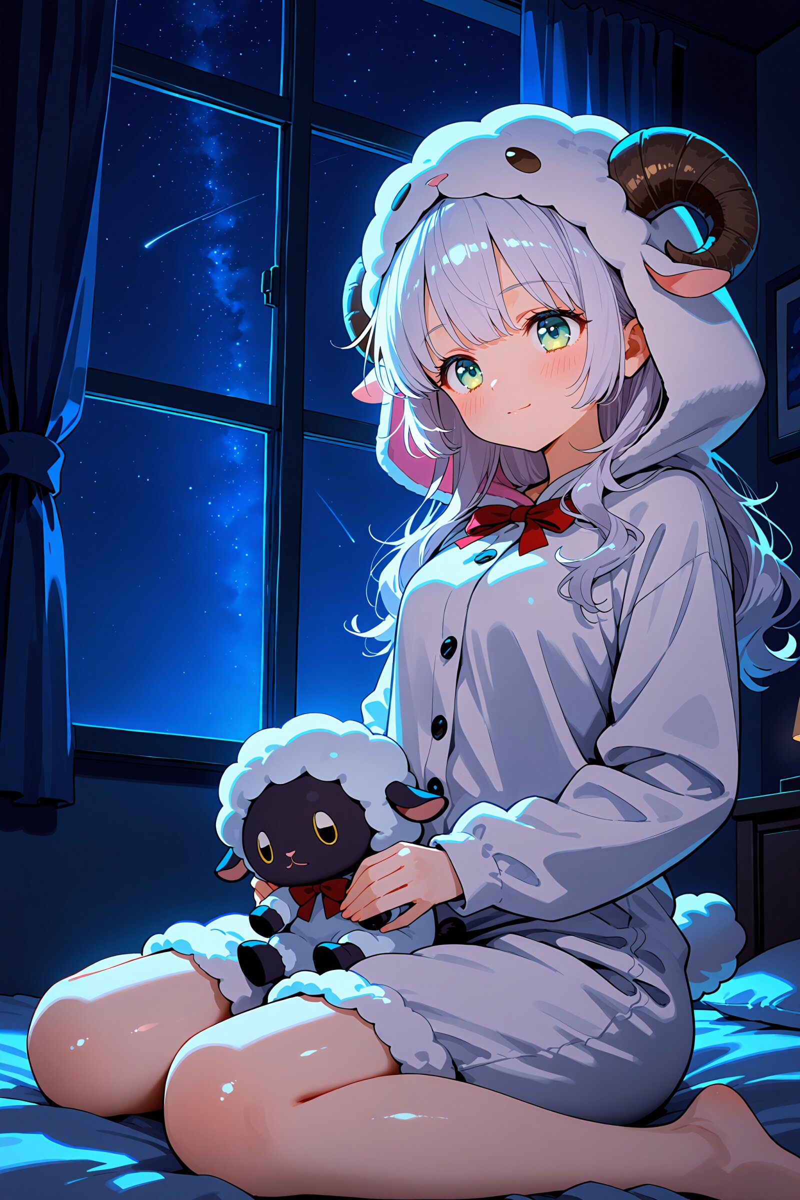 背景と夜空でかかる影がとても素敵です、そして頭と足のもこもこが暖かそう!