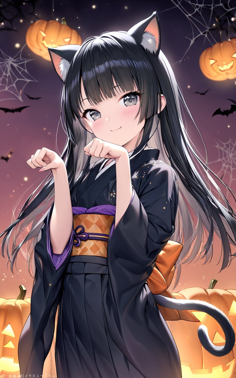 (best quality),(masterpiece),(ultra detailed),absurdres,hires,ultra detailed, high resolution hires, best quality, master piece, Cute 1Girl, 16years old, Smile, black hair, hime cut, long straight hair, black eyes, Slim body, Japanese clothes (Black Furisode kimono) , dressed in a cute cat costume attending a Halloween party. She has feline ears, a tail, and whiskers, with a playful and cheerful expression. The background features Halloween decorations such as pumpkins, cobwebs, and colorful lights, creating a festive and lively atmosphere, paw pose,Japanese clothes Furisode kimono Hakama