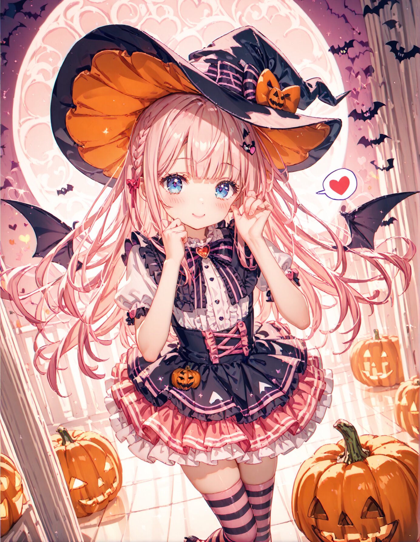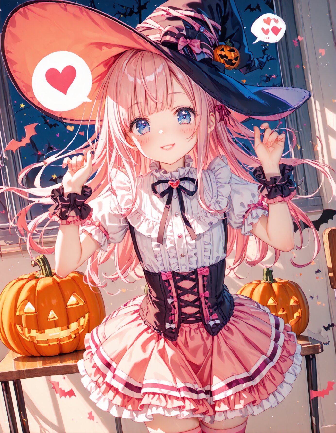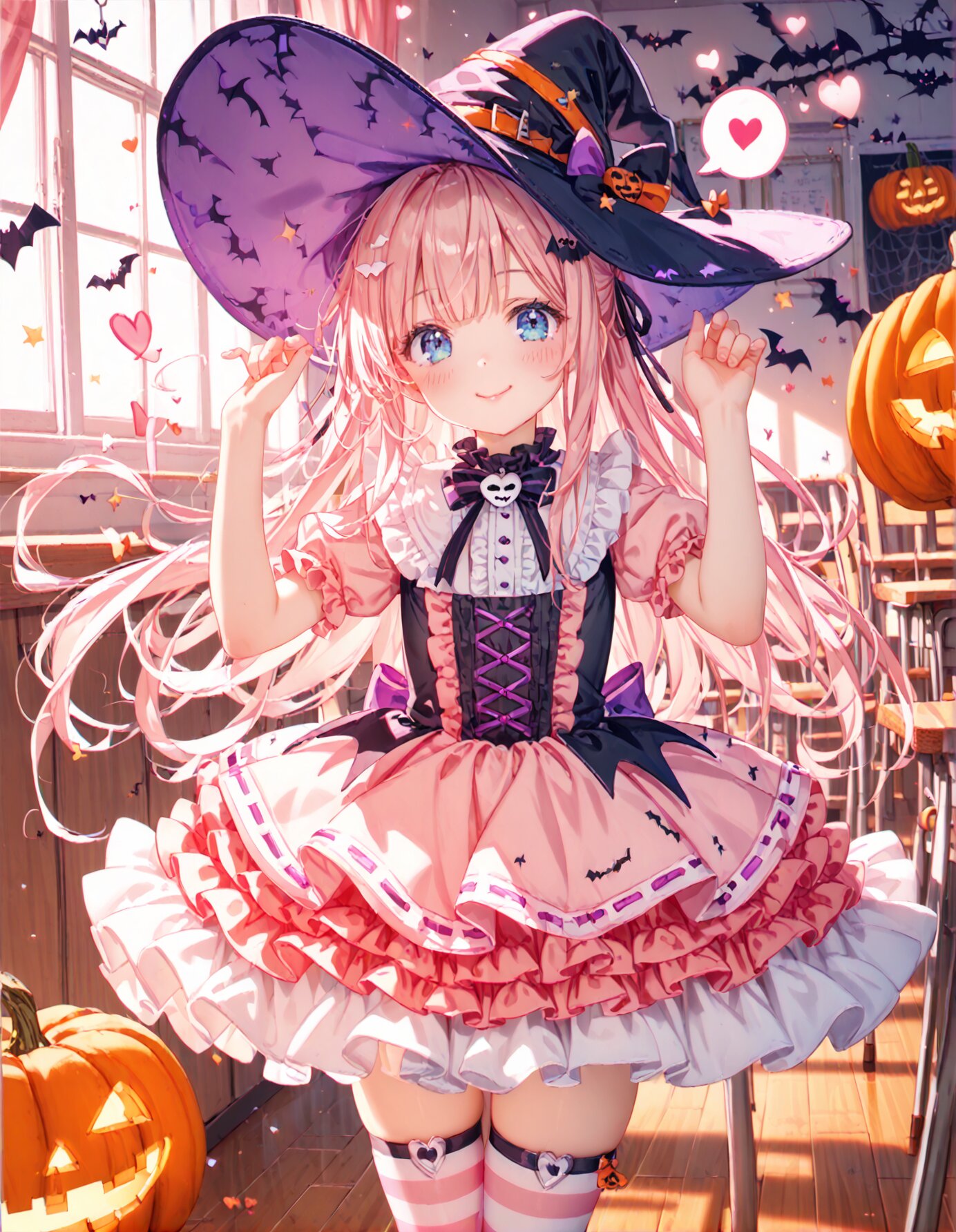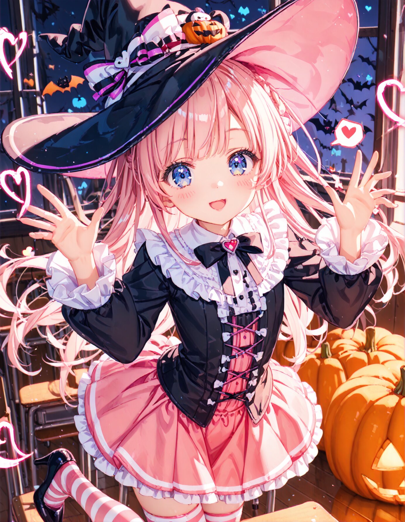 score_9, score_8_up, score_7_up, score_6_up, score_5_up, score_4_up, rating_safe, masterpiece, best quality, high quality, highres:1.0, ultra detailed, incredibly absurdres:1.0, textuer:1.0, source_anime:1.0, resized, vivid colors, perfect composition, (perfect anatomy:1.3), five fingers, beautiful detailed skin, extremely detailed clothes, detailed prism eye, (Halloween Theme:1.3), (dynamic angle:1.2), cowboy shot, a cute loli girl, detailed face, (shinny light pink hair:1.2), cute girly hairstyle, blue eyes, Glossy pink Lips, witch hat, witch costume, witch girl, (orange and pink theme:1.2), lolita fashion, frilly dress, mini skirt, (frilly shirt:1.2), (pink colored culottes skirt:1.2), (orange and pink striped thighhighs:1), (zettai ryouiki:1), high heels, (The hem of her short skirt, and the top of the socks fits snugly around her thighs). cute smile, blush, look at viewer, hands up, (spoken heart:1.2), (heart effect:1.3), (lots of flying hearts:1.3), Jack-o'-lanterns, flying bats, (night time), moon lighting, (indoor:1.2), (in the Decorated classroom:1.2), <lora:flat_sdxl:-1> <lora:Fixhands_anime_bdsqlsz_V1:1>