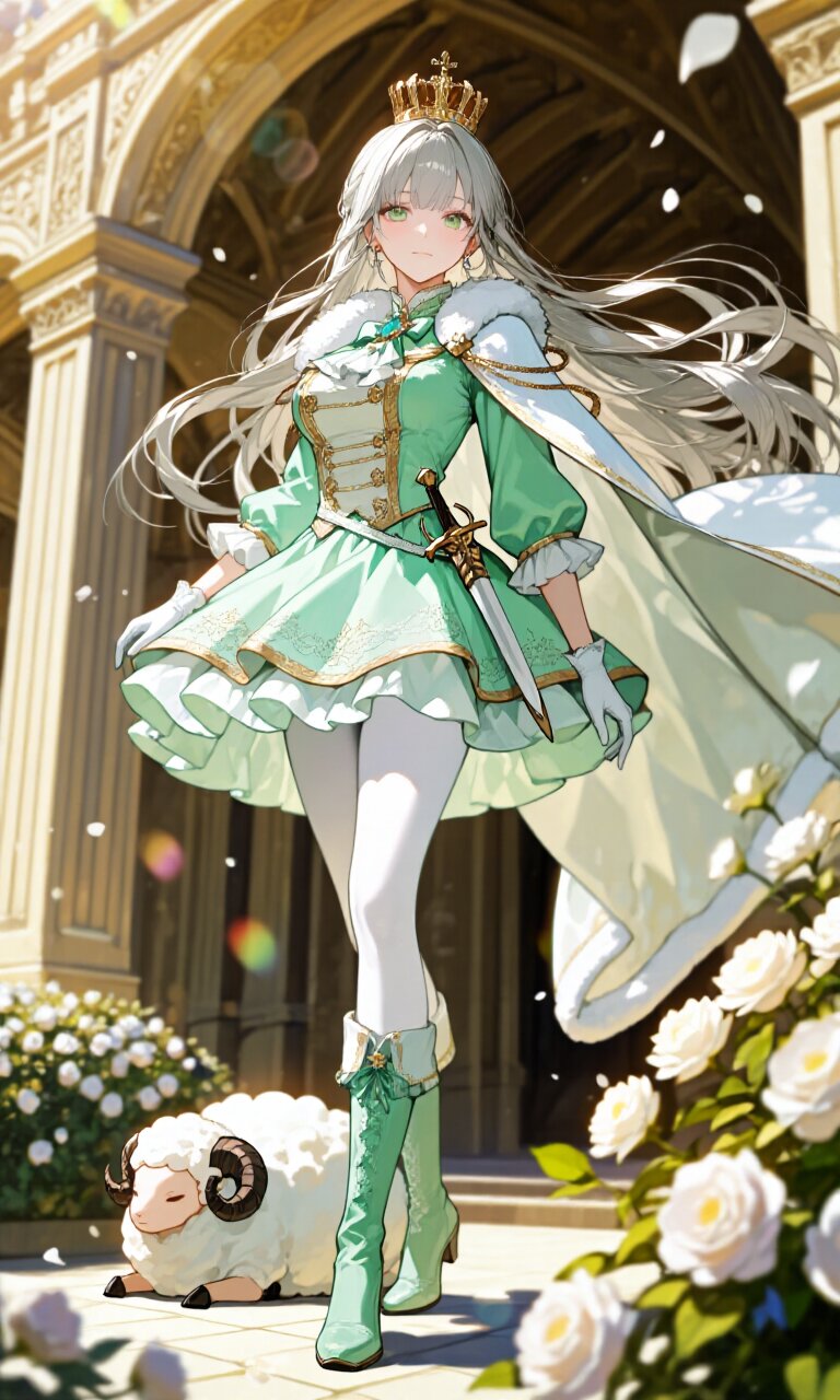 A stunning 22-year-old woman with mesmerizing light green eyes and extremely long, flowing silver hair stands proudly in a rococo palace courtyard during a golden afternoon. She wears an exquisite (Pale Green luxurious Prince costume:1.6) with intricate embroidery, paired with a (white tights:1.3) and (luxurious mini skirt:1.4) that billows elegantly. Her outfit is completed with (pale green luxurious boots:1.3), (White gloves:1.2), and a regal (crown:1.3) atop her head. A (dagger on waist:1.3) glints at her hip while a majestic (White luxurious Cape:1.3) flows behind her. The delicate-faced beauty stands amidst blooming flowers with perfect posture, her detailed skin glowing under soft sunlight that creates gentle lens flares. A fluffy white sheep rests nearby as the romantic academia atmosphere of the ornate palace surrounds her. Every detail from her elaborate costume to the rococo architecture is rendered with insanely detailed, 16k quality precision, creating a masterpiece of beauty and elegance.