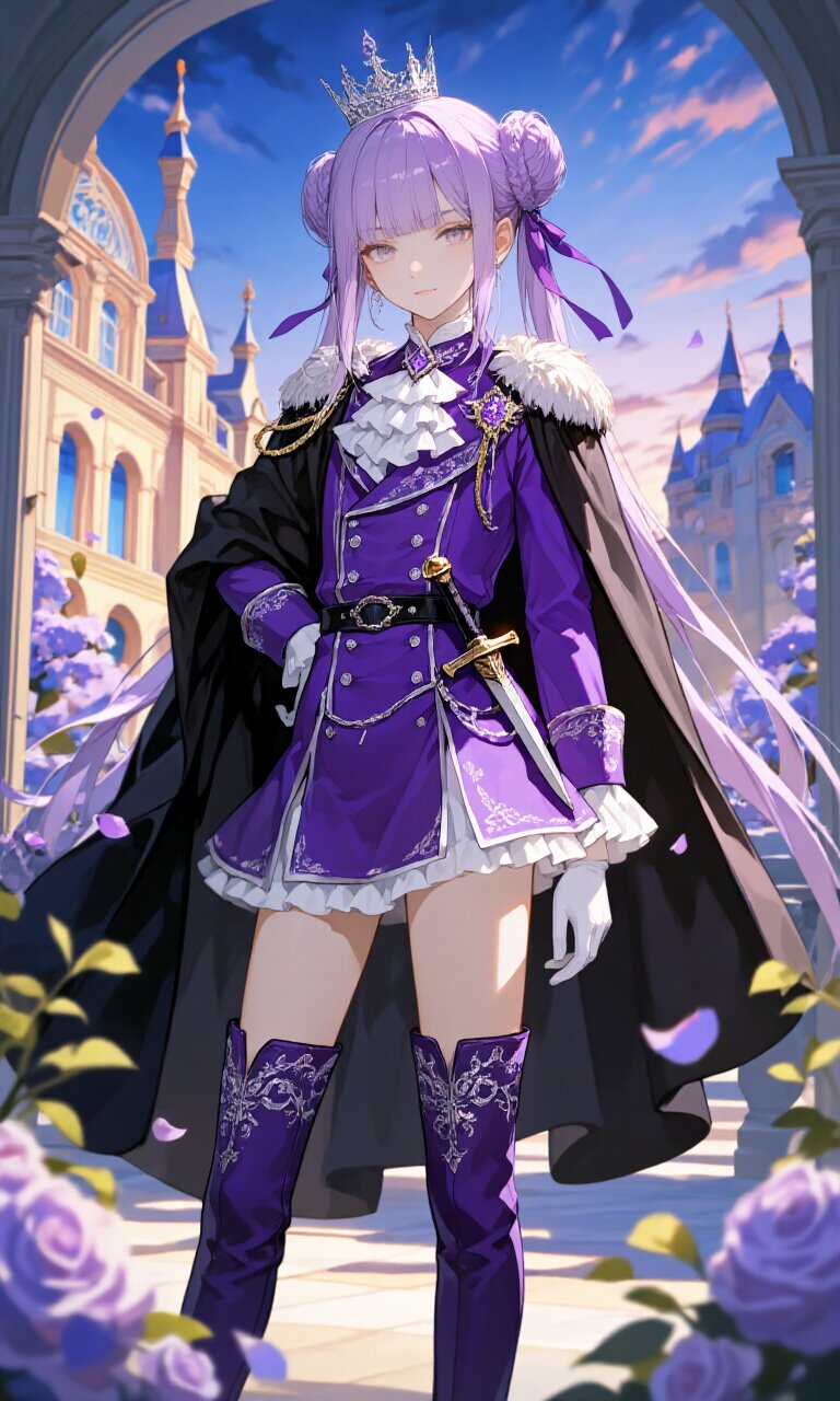 A breathtakingly detailed portrait of a beautiful androgynous prince with pastel purple straight hair styled in elegant twin buns, framing a delicate yet striking face with calm violet eyes and flawless porcelain skin. He wears a (Purple luxurious Prince costume:1.6) with intricate embroidery, paired with a (mini skirt with white frill:1.4) and a (Black luxurious Cape:1.3) draped dramatically over one shoulder. His attire is completed with (purple luxurious boots:1.3), a (dagger on waist:1.3), a regal (crown:1.3), and pristine (White gloves:1.2), while a (white frilled ribbon tie:1.2) adds a soft contrast. Standing in contrapposto outside a grand palace at dusk during the blue hour, he is surrounded by blooming flowers under soft romantic lighting. The art deco architecture and romantic academia aesthetic enhance the dreamy, aristocratic atmosphere, with every fabric fold, hair strand, and architectural detail rendered in insanely high 16k quality.