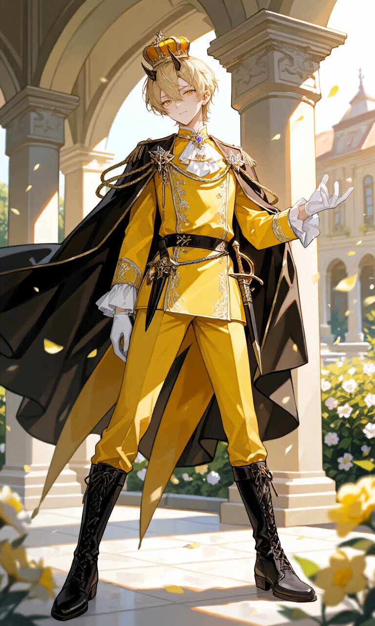 A 20-year-old male with delicate facial features stands in a contrapposto pose with legs slightly spread, exuding princely elegance. His short blonde hair falls between his narrowed yellow eyes, complemented by small horns protruding from his forehead. He wears a (Yellow luxurious Prince costume:1.6) with long sleeves and intricate embroidery, paired with (Yellow luxurious pants:1.4) and (black luxurious boots:1.3). A (Black luxurious Cape:1.3) drapes dramatically from his shoulders, fastened with an ornate clasp. His attire is completed with (White gloves:1.2) and a (dagger on waist:1.3) in a gilded sheath. A gleaming (crown:1.3) rests upon his head, accentuating his regal bearing. The scene unfolds outside a grand renaissance-style palace in the afternoon, where subtle (sunlight) filters through the columns, casting soft beams across the marble flooring. Delicate flowers (bloom) in the palace gardens, their petals catching the golden light. The romantic academia aesthetic is enhanced by the play of (sunbeam) across the prince's form, highlighting every exquisite detail of his (detailed face), (detailed skin), and (detailed hair). The composition masterfully blends fantasy and historical elegance with its (insanely detailed) textures and (soft lighting).