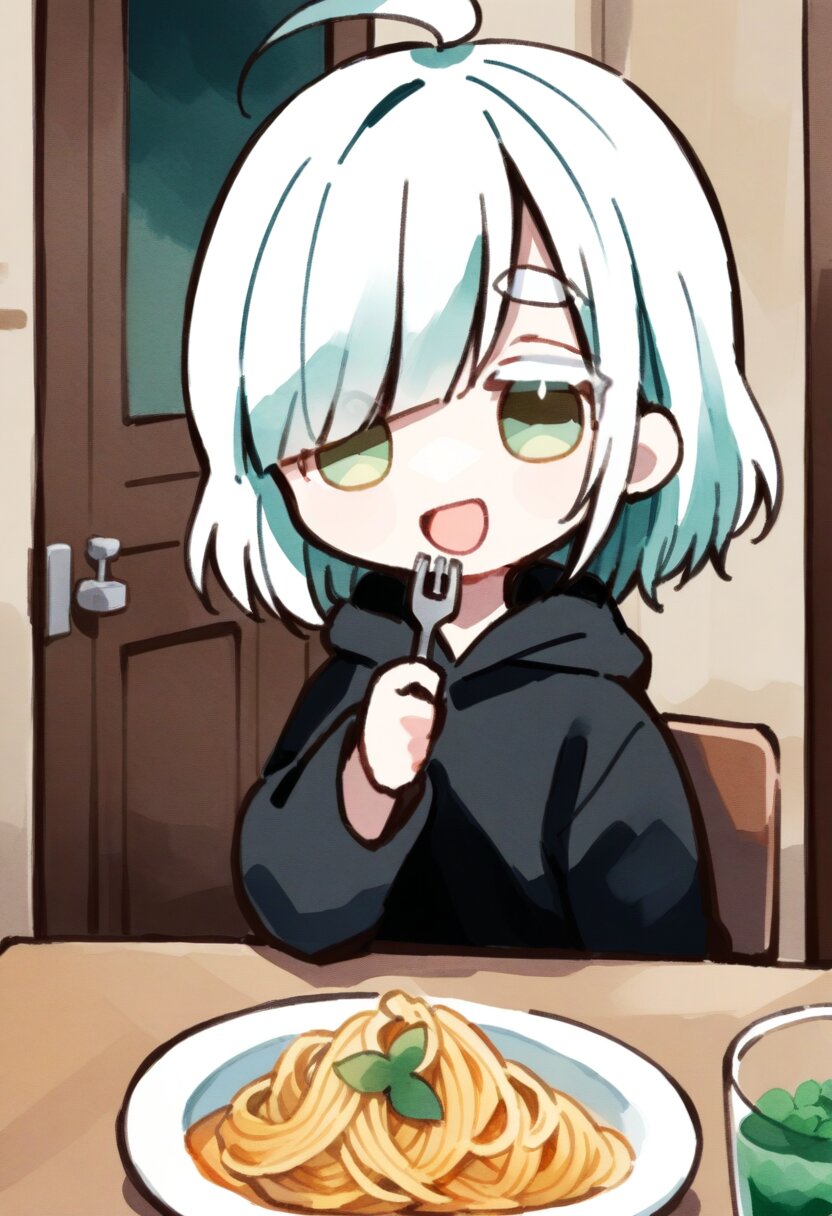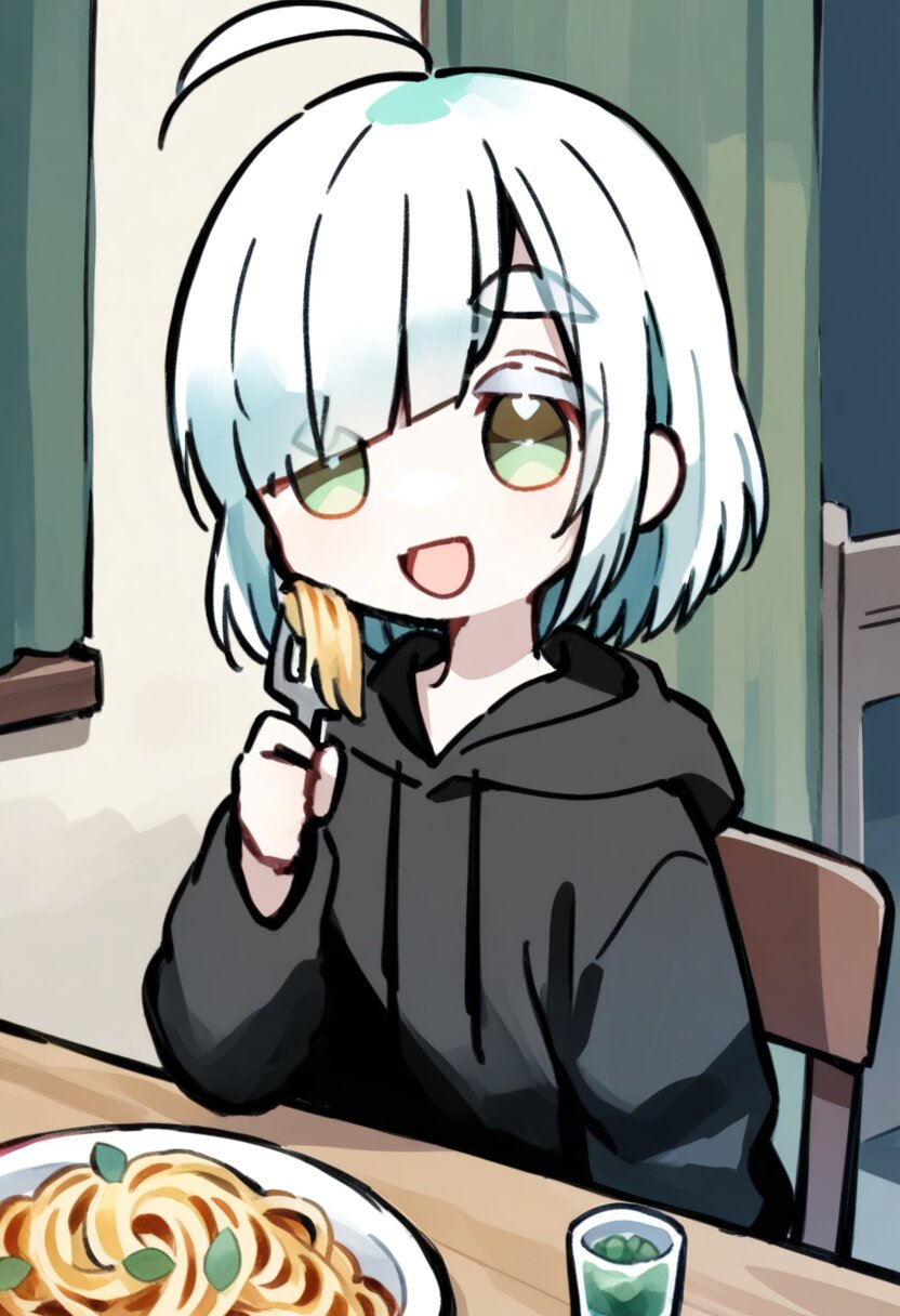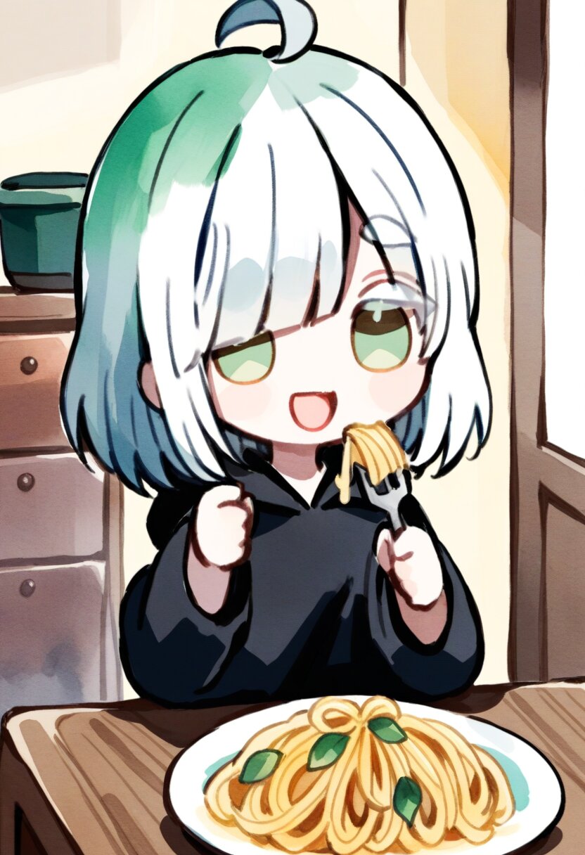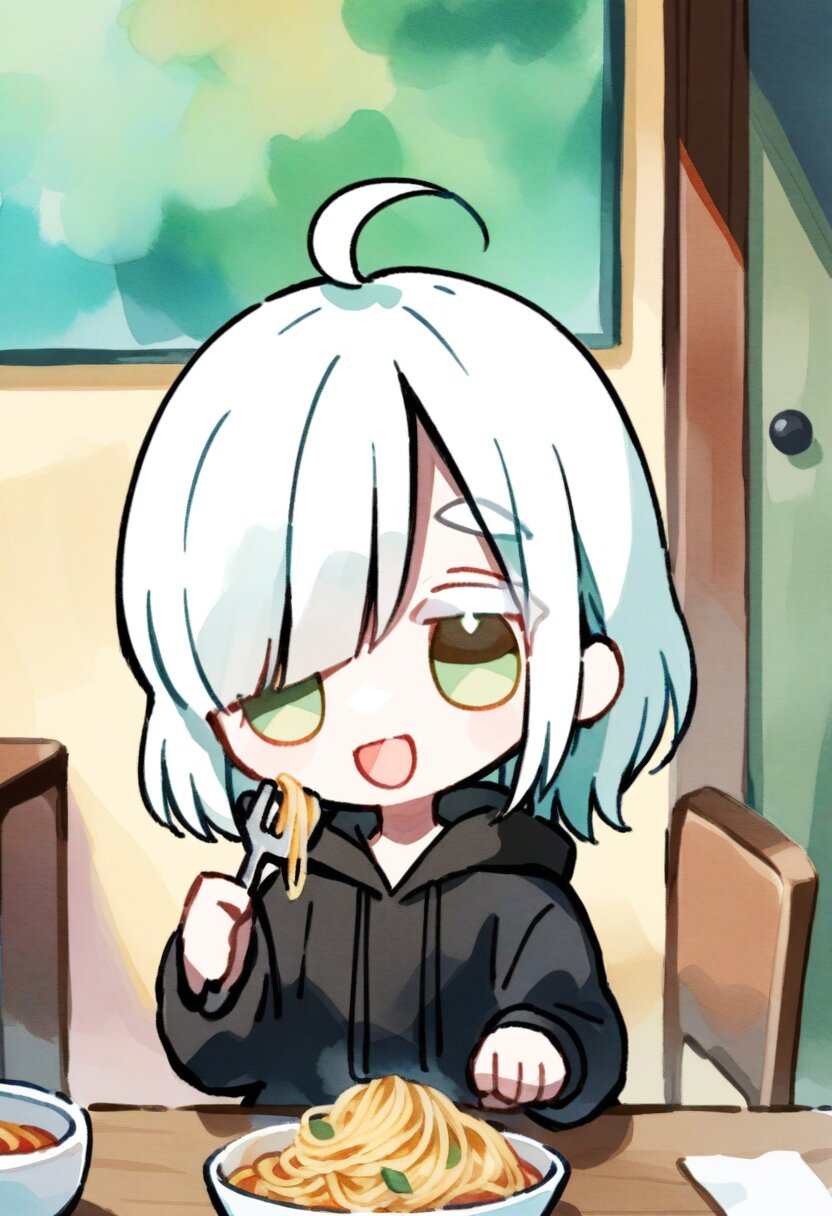 <lora:inmnstylexl:1>, best quality, masterpiece, very aesthetic, watercolor painting, general, 1girl, chibi, solo, (bright white hair), short hair, blunt bangs, white thick eyebrow, white colored eyelashes, (hair over one eye), ahoge, mintgreen eyes, oversize black hoodie, smile, open mouth, holding a fork, pasta, table, room