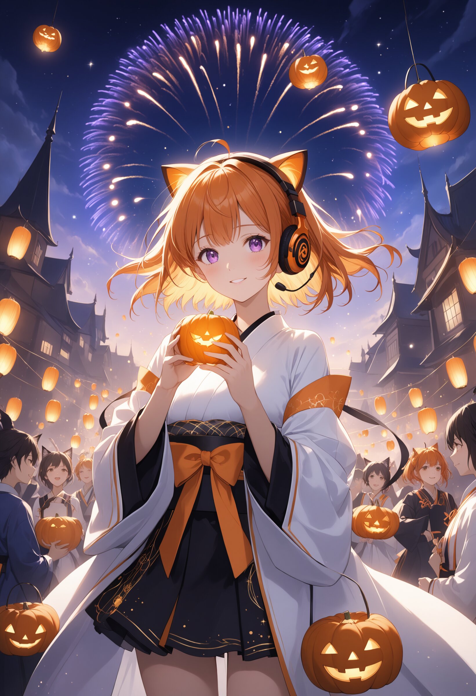 🎃 Zena — Magic Academy Halloween Festival Fireworks > A cinematic, ultra-detailed portrait of Zena, the Japanese cyber-pop idol student with vivid orange bob hair glowing like a lantern flame and her signature futuristic orange headphones softly pulsing with magical energy. She stands in the courtyard of the Magic Academy during the grand Halloween Festival, surrounded by students in enchanted costumes, floating jack-o’-lanterns, and shimmering ribbons of magical light. Zena gazes upward, eyes wide with emotion, as the night sky blossoms with magical fireworks shaped like glowing magic circles. Each radiant circle spins slowly, engraved with ancient runes and sigils, bursting into delicate patterns of gold, violet, and silver light that ripple through the stars. The air is filled with gentle enchantment — floating lanterns drift among the towers of the academy, black cats made of starlight leap across rooftops, and the faint melody of a magical orchestra fills the night. Zena’s Halloween idol outfit — adorned with an obi-style ribbon, kimono-inspired sleeves, and a layered mini-skirt with spiderweb lace and candy motifs — shimmers with the reflected glow of the fireworks. The soft satin and matte fabrics seem alive under the luminous sky. A single tear shines on her cheek as she whispers, “It’s so beautiful… like the stars themselves are celebrating.” Around her, the magic circles in the sky begin to rotate in rhythm with her heartbeat — a silent symphony of light and feeling, uniting magic, music, and emotion into one breathtaking moment. Style: ultra-realistic, fantasy cinematic lighting, ethereal glow, delicate details, magical atmosphere, 8K resolution, emotional and poetic tone, glowing runes and fireworks, soft bokeh.