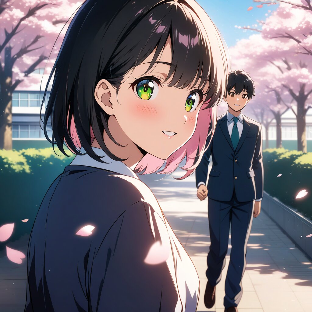masterpiece, best quality, highres, ultra-detailed, very aesthetic, 2people, a girl and a boy, walking outdoors, school uniforms, pink hair, green eyes, black hair, brown eyes, happy expression, blushing, cherry blossoms, falling petals, school building in background, sunny day, light reflections, glossy finish, smooth shading, vibrant colors, detailed clothing, dynamic lighting, anime illustration style, clear focus, depth of field, full body shot, outdoor setting