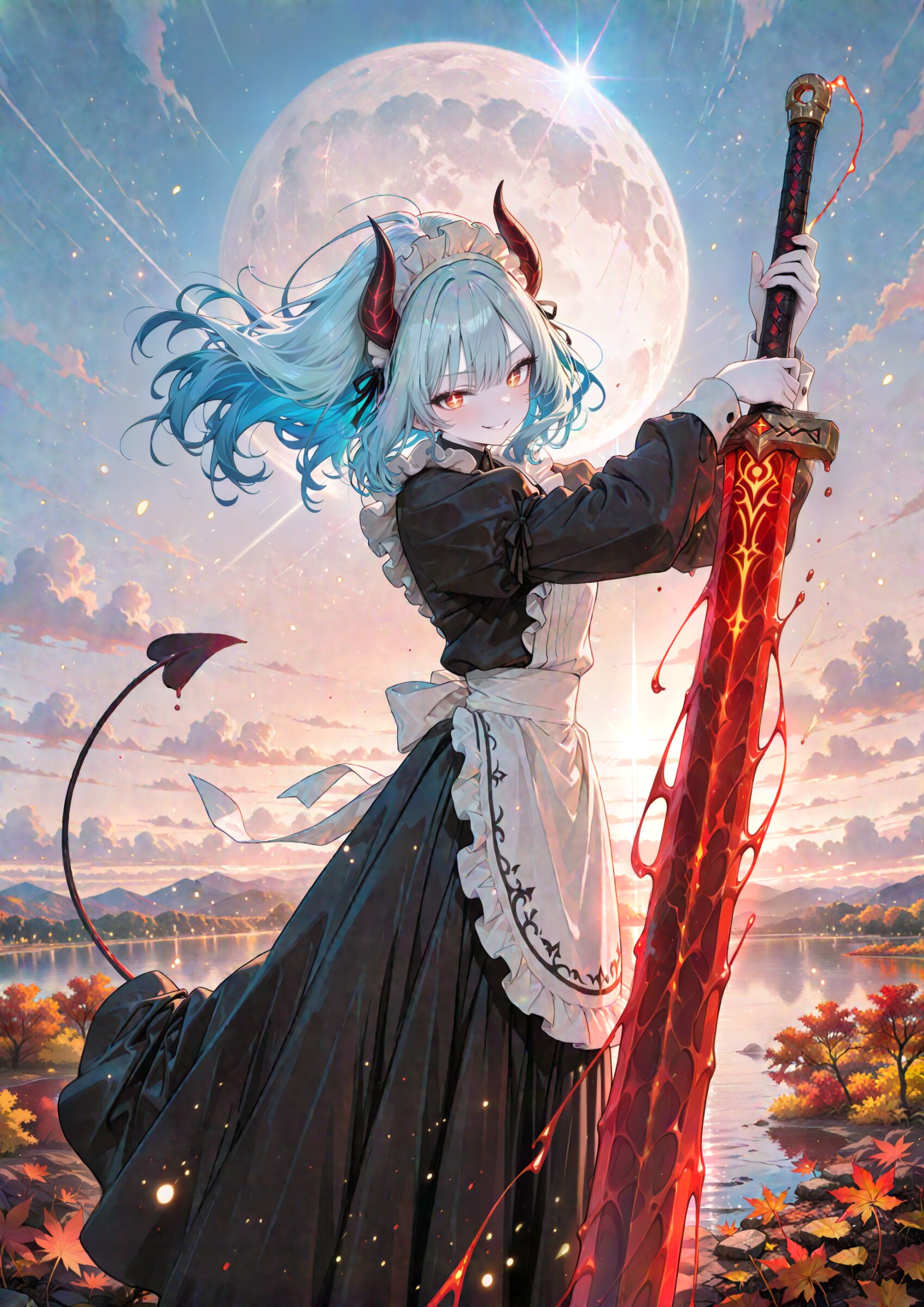 foreshortening, (face:1.3) looking to the side, dynamic angle, looking at viewer, autumn atmosphere, earthy color, melting, lake, 1girl, (ultra-detailed), solo, maid, pale skin, pale skyblue hair, (beautiful slit pupils, naughty face:1.0), long sleeves classic maid uniform, long skirt, maid headdress, maid apron, luminous effect lens flare lotion shiny-glistening cute girl solo foreshortening, , (demon girl, demon horns, demon tail, , + +, midair, flying, floating hair, falling :1.1), super fine concept art, hard surface, graceful eyes, masterpiece, best quality, amazing quality, very aesthetic, absurdres, newest, professional art lots of details, , overexposure, sumie effect style, 4ur4_illu,shiny, glowing, glowing particles, glowing light particles, light particles, cinder, <lora:noline (1):-0.5> <lora:sdxl2-flat2-512b:-0.2> <lora:facelightup_xl_v10:0.5> <lora:V2_yakumo_alchemy:0.5> <lora:Aura_illu:0.1>