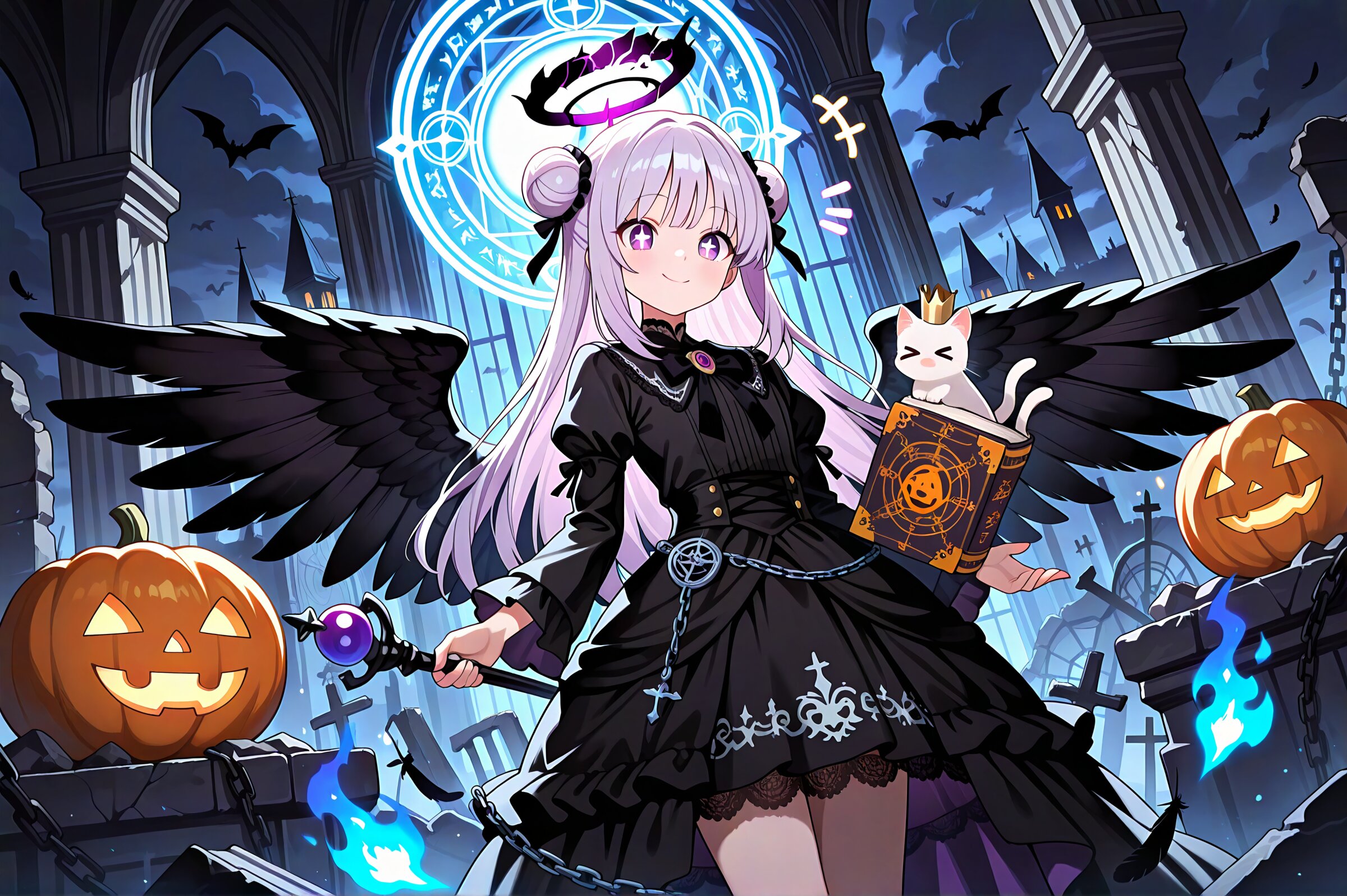 1 little otoko no ko, solo, diagonal angle, masterpiece, best quality, amazing quality, very aesthetic, light purple hair, long hair, double bun, straight hair, purple eyes, +_+, closed mouth, smile, cheerful, +++, notice lines, cat on her shoulders,> <, fallen angel, black wings, broken halo, jeweled crown, ornate scepter, grimoire, magic circle, blue flame, chain, black dress, lace, divine aura, standing pose, wings spread, backlight, halloween, night, pumpkin, rays of light, dark clouds, ruins, feathers floating, ethereal atmosphere, gothic cathedral background, heavenly yet sinful, dramatic lighting,