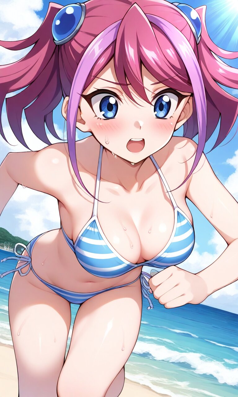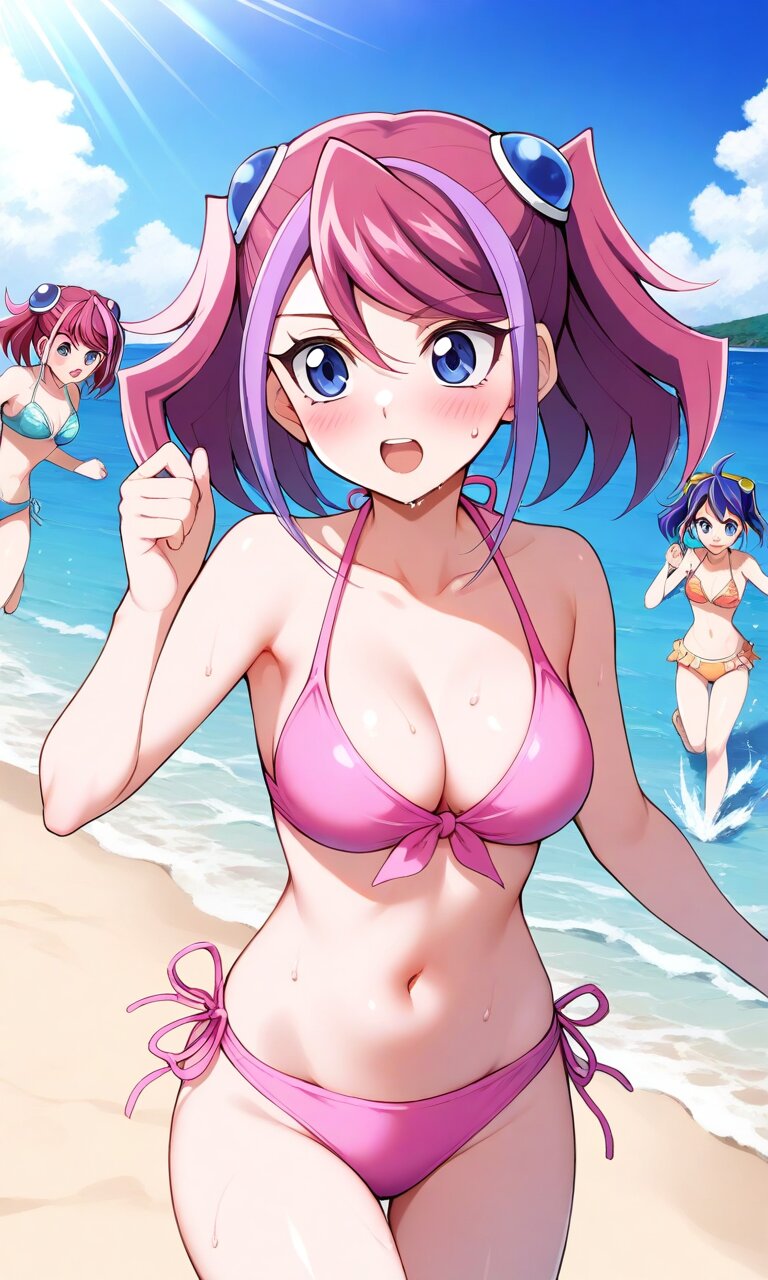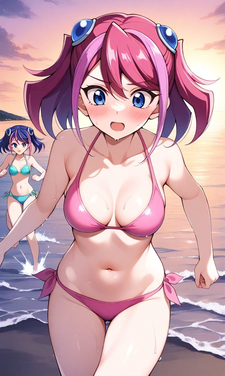 Hiiragi Yuzu (YU-GI-OH! ARC-V), blue eyes, hair ornament, blue hairclips, medium hair, multicolored hair, pink hair, streaked hair, twintails, medium breasts, NSFW, masterpiece, best quality, extremely detailed, beautiful detailed girl, joyful expression, shiny skin with sweat, wearing skimpy bikini with bright colors, running on Yakushima Island's sandy beach, ocean waves crashing, breasts bouncing, vibrant tropical sunlight, perfect anatomy