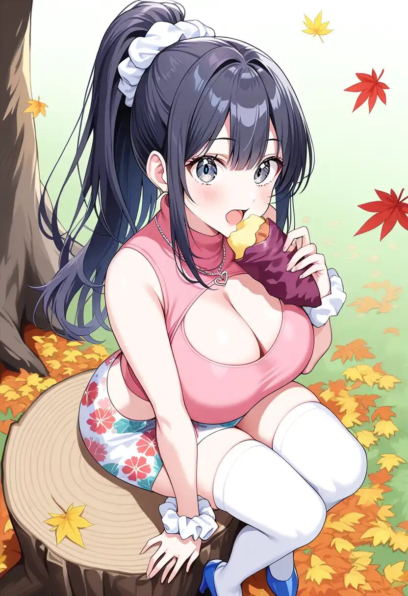 [eating roasted sweet potato]++, [holding roasted sweet potato]++, [cleavage cutout]++, pink turtleneck sweater, [beautiful girl]++, [huge breasts]++, perky breasts, hanging breasts, curvy, cleavage, heart necklace, sleeveless, bare shoulders, bare arms, hair scrunchie, wrist scrunchie, white scrunchie, midriff, floral skirt, white thighhighs, blue high heels, full body, [sitting on tree stump]++, [Beautiful skin]++, tall, [long hair]++, shiny, shiny skin, [big eyes]++, [shining eyes]++, [beautiful face]++, smile, blush, open mouth, outdoors, day, autumn leaves, tree, from above, high ponytail,