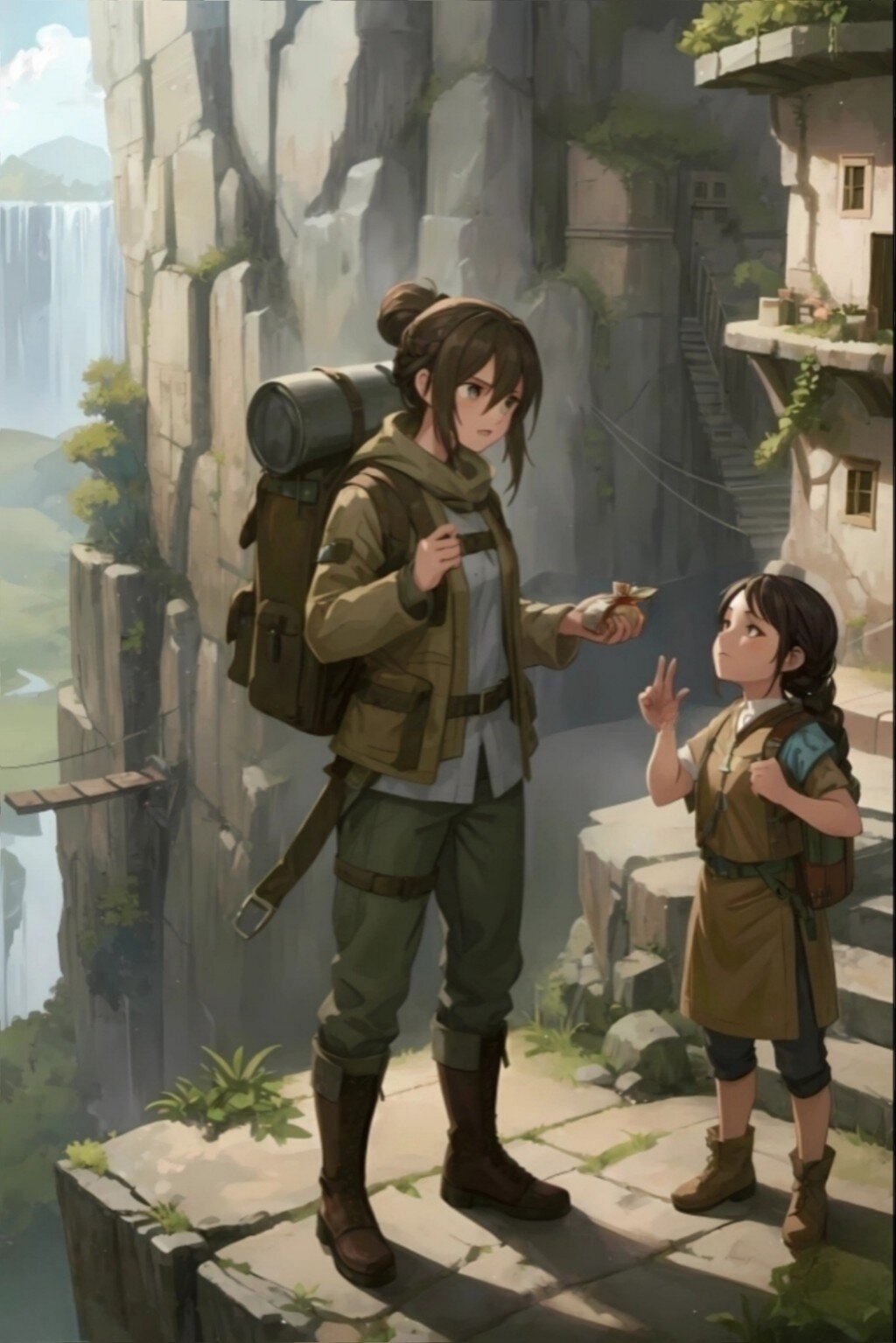 "A stylized anime-style illustration of a 20-year-old female traveler with brown hair styled in an updo and sleepy eyes, wearing a beige utility jacket, long gray pants, and sturdy dark leather boots. She carries a large backpack with a gray rolled-up sleeping bag on top, and a blade sheath is strapped to her thigh. She is interacting with a young local girl with dark braided hair and traditional clothing, making hand gestures. They are in a village built into the side of a cliff in an unexplored valley. The background shows a detailed, realistic landscape from the top of a steep cliff, featuring a winding river below, a rope bridge, and intricately carved rock dwellings with stairs. Soft lighting and shadow, full body shot, fantasy adventure.