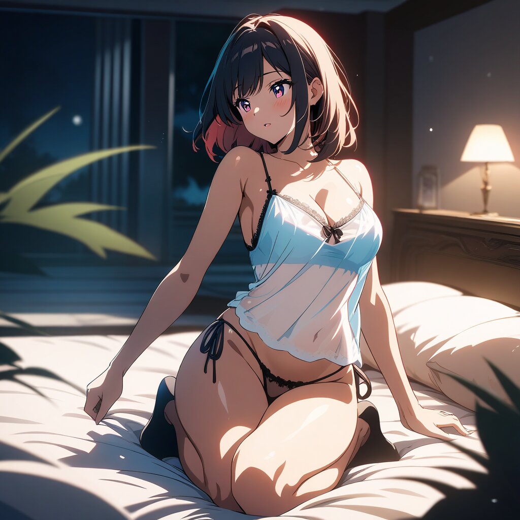 masterpiece, best quality, highres, ultra-detailed, very aesthetic, glossy finish, smooth shading, vibrant colors, detailed clothing, dynamic lighting, anime illustration style, clear focus, depth of field, full body shot, outdoor setting、bedroom,(see-through camisole:1.2), cleavage, side-tie panties,(special occasion thong panties:1.3), wariza,armpits,