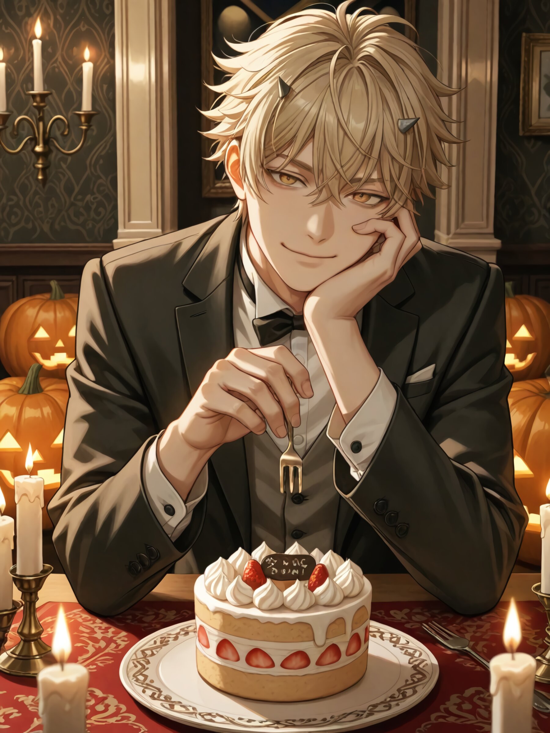 1male, solo, blonde hair, short hair, hair between eyes, yellow eyes, small horns on head, 20 years old, narrowed eyes, smile, looking at viewer, elegant expression, eating a piece of Halloween cake with a fork, sitting at a café table decorated with pumpkins and candles, relaxed pose, refined and mature atmosphere, warm evening lighting, soft detailed shading, realistic fabric folds, detailed background, anime style, masterpiece, best quality, highly detailed, beautiful lighting, cinematic composition, finely detailed eyes