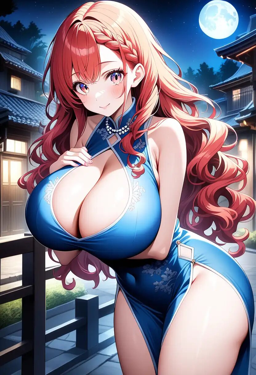 [diamond cutout]++, cleavage, china dress, [beautiful girl]++, [huge breasts]++, perky breasts, hanging breasts, curvy, pearl necklace, sleeveless, bare shoulders, bare arms, side slit, bare legs, cowboy shot, [Beautiful skin]++, tall, [long hair]++, shiny, shiny skin, [big eyes]++, [shining eyes]++, [Beautiful legs]++, [beautiful face]++, legs together, hand on breast, standing, smile, blush, closed mouth, residential area, night, outdoors, crowd, full moon, starry sky, wavy hair,