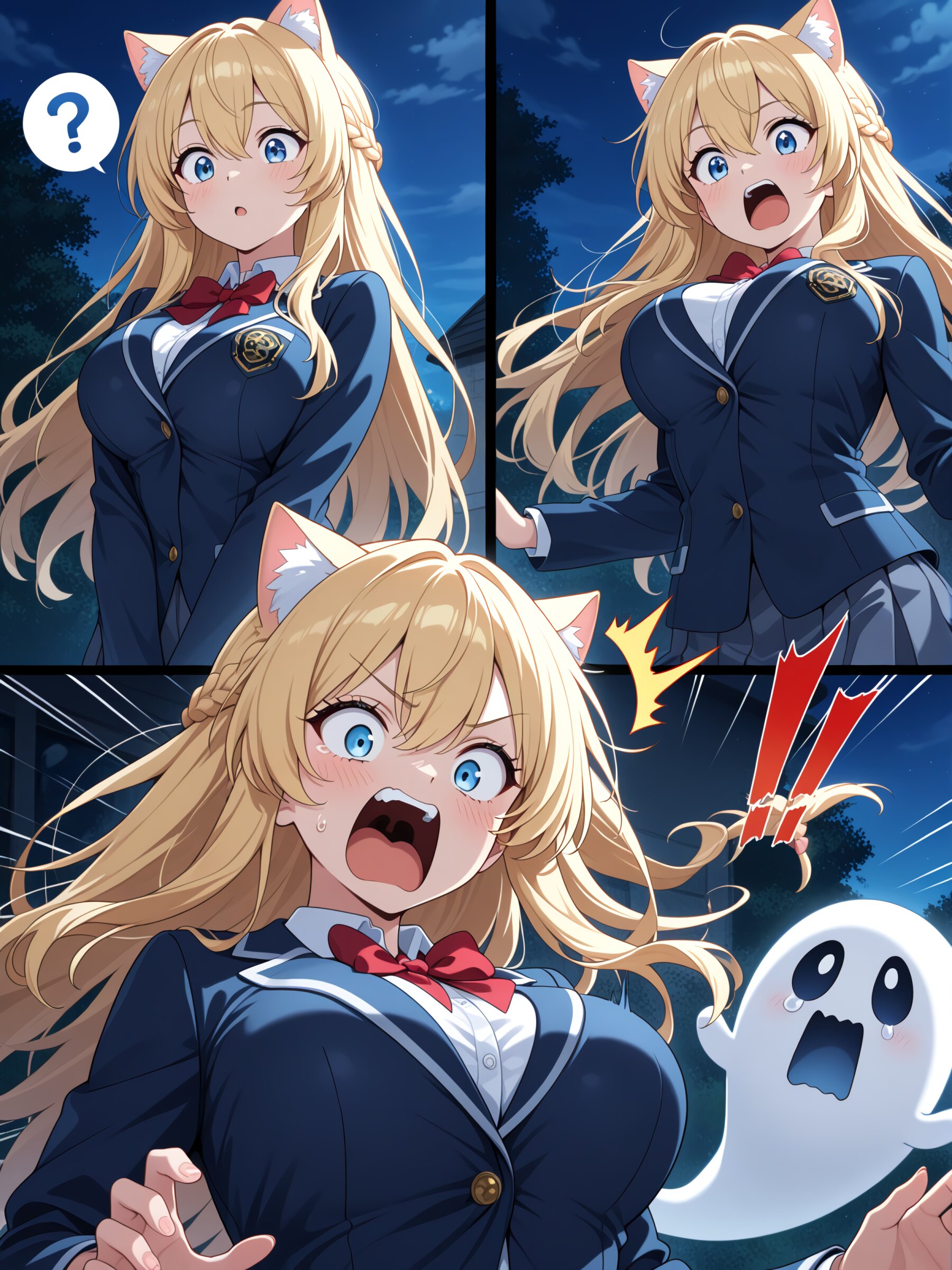 (masterpiece, best quality, ultra-detailed, intricate details, anime style, 8k illustration), 1girl, blue eyes, blonde long hair, braid, blonde cat ears, hair between eyes, large breasts, school uniform, blazer, (surprised, screaming:1.2), teary eyes, eyes open, spoken exclamation mark, spoken question mark, looking down, dynamic pose, (a cute big ghost that suddenly appeared:1.2), night, dynamic composition, detailed background, daylight, anime style, soft lighting, high detail, expressive face