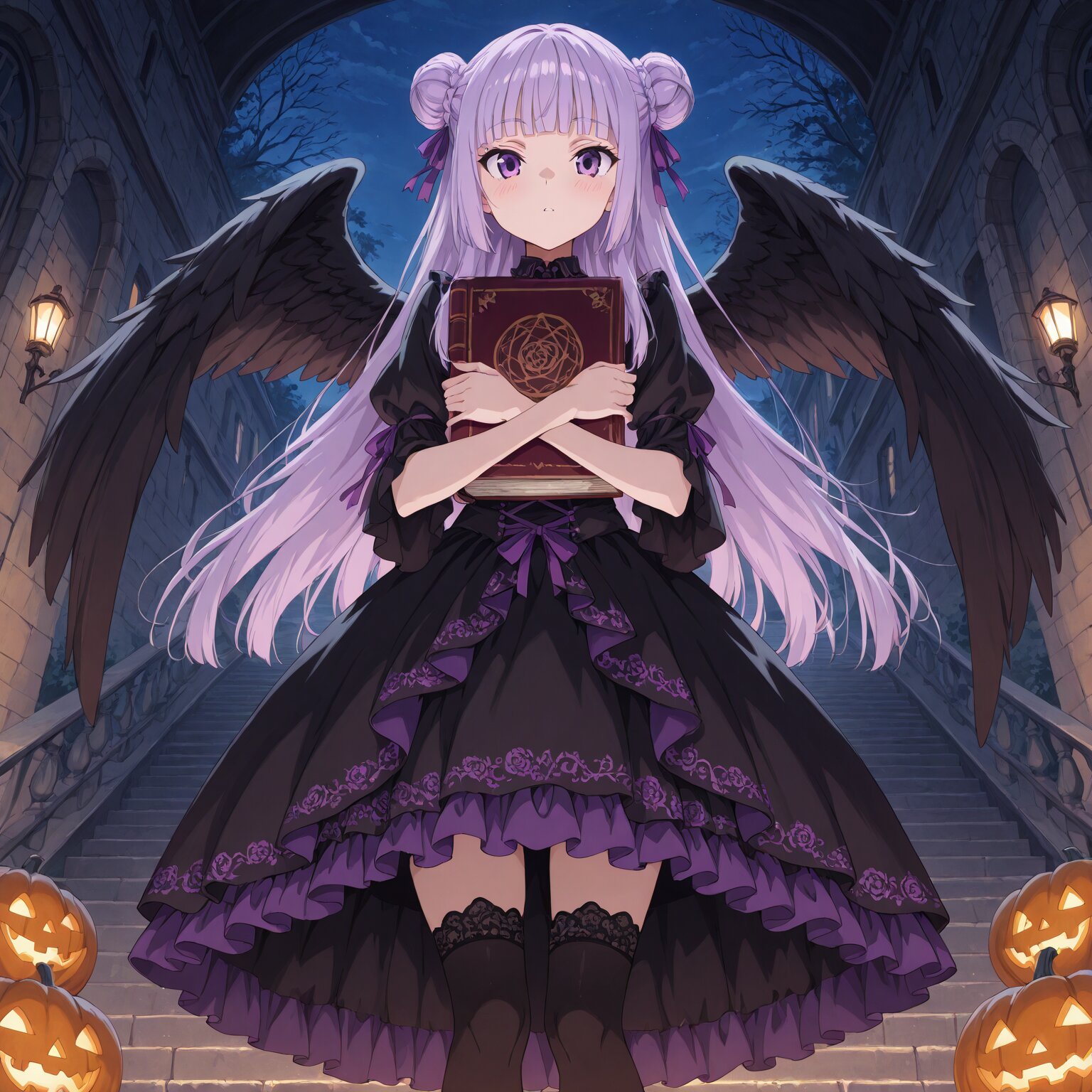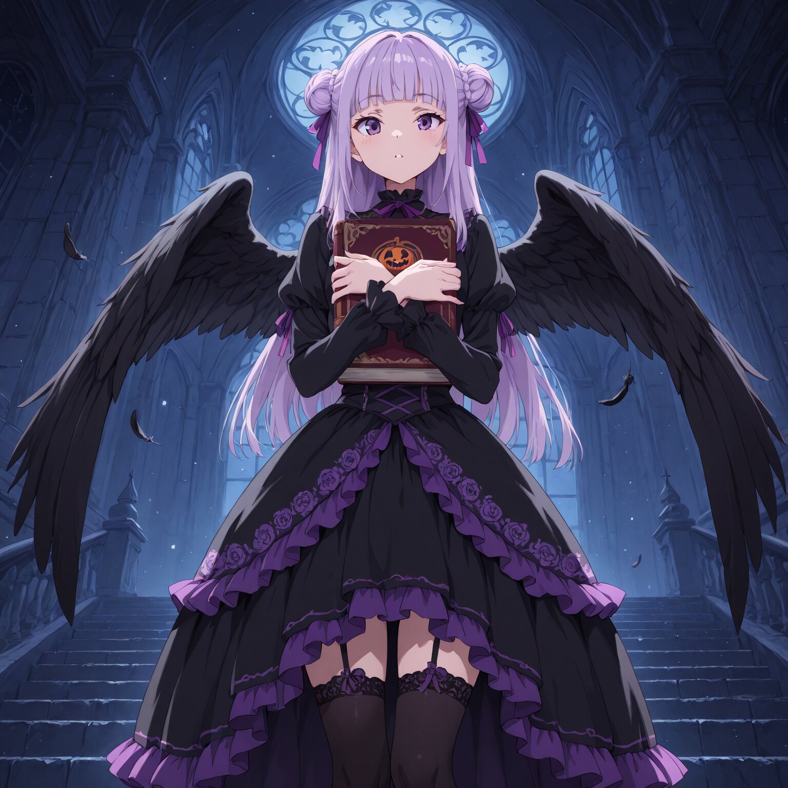 (1girl) BREAK , Light purple hair, long hair, bun, straight hair, blunt bangs, Purple eyes Black wings, feathers Black dress, ruffled skirt, black knee-high socks, Purple embroidery, purple ribbon, long skirt Carrying a thick book, a grimoire Western castle, terrace Halloween, Night, Halloween night, party venue BREAK, ((newest, year 2024, anime, animation, anime screen capture, anime style:1.3)) BREAK, ((masterpiece, , vibrant, very aesthetic, highly detailed, best quality, 16k:1.3)) Perfect hands, perfect fingers,
