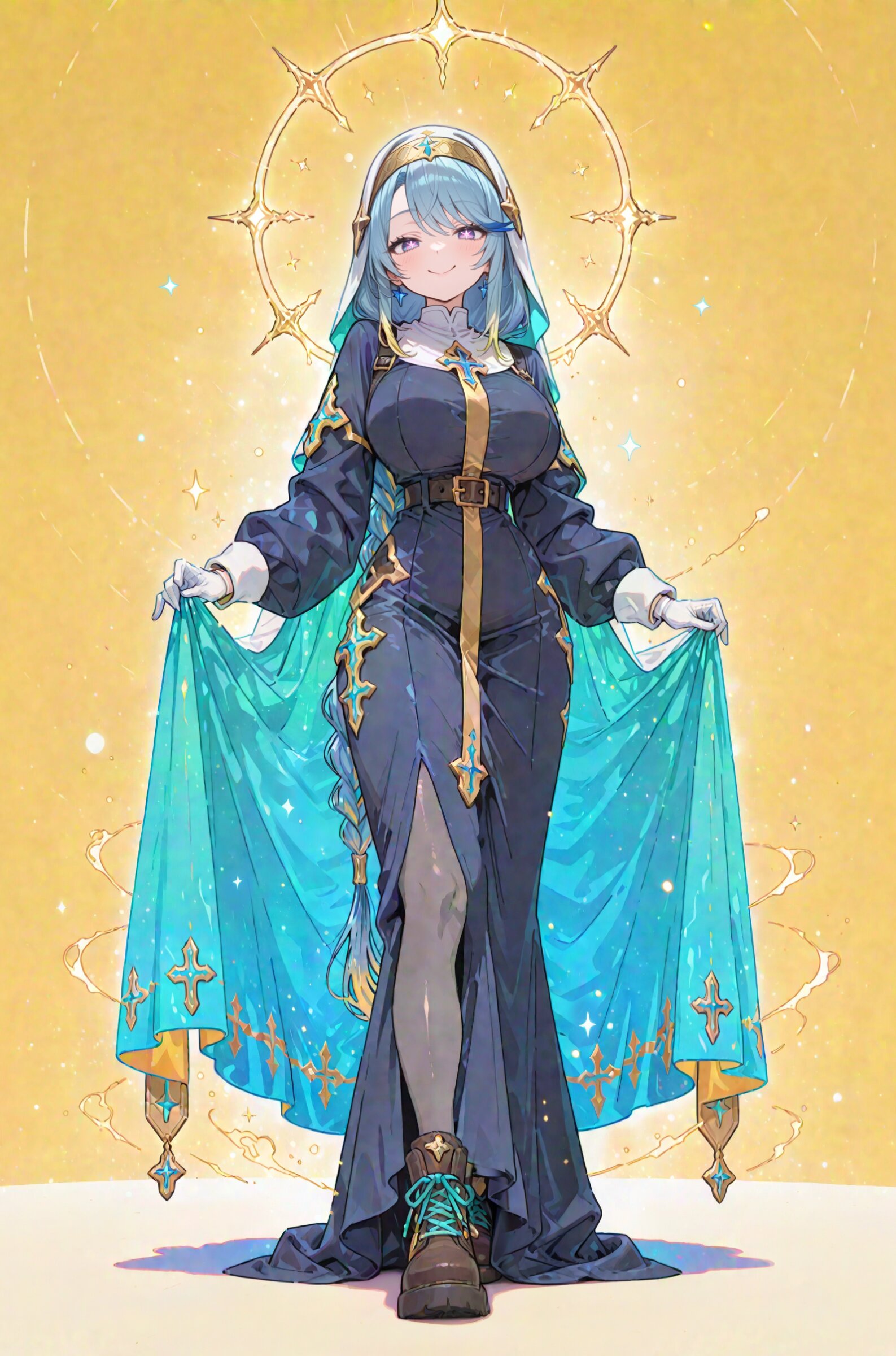 straight-on (close up:1.2) focus head (fisheye lens angle:1.0), looking at viewer, (simple light chartreuse yellow background:1.1), drop shadow, colored shadow, 1girl, priest, beautiful detailed eyes, holy face, cool Elegant and sophisticated demeanor, (light skin:1.0), skindentation, beautiful steelblue eyes, pink pupils , pale blue hair, lightyellow colored tips, very long hair, french braided ponytail swept bangs , shiny and strong hair, first-rate female bodies perfect body beautiful huge breasts medium hips, narrow waist, solo, nun, Good texture Gold hair ornaments, aqua laced cape, , white pious Cope, long sleeves, the feel of fluffy, , belt buckle, chest belt, , white gloves, , long skirt, (silk overskirt:1.0), grey pantyhose, ankle boots, (teasing smile:1.2), (respectful smile:1.0), balancing super fine concept art, hard surface, graceful eyes, masterpiece, best quality, amazing quality, very aesthetic, absurdres, newest, professional art lots of details, , overexposure, shiny-glistening, (watercolor style:0.0), (pastel color style:0.0) 4ur4_illu,shiny, glowing, glowing particles, glowing light particles, light particles, chartreuse yellow wind , <lora:noline (1):-0.5> <lora:sdxl2-flat2-512b:-0.5> <lora:facelightup_xl_v10:0.5> <lora:V2_yakumo_alchemy:0.2> <lora:Aura_illu:0.1>