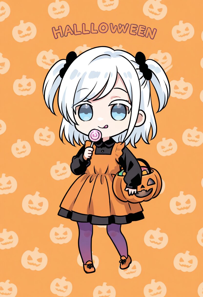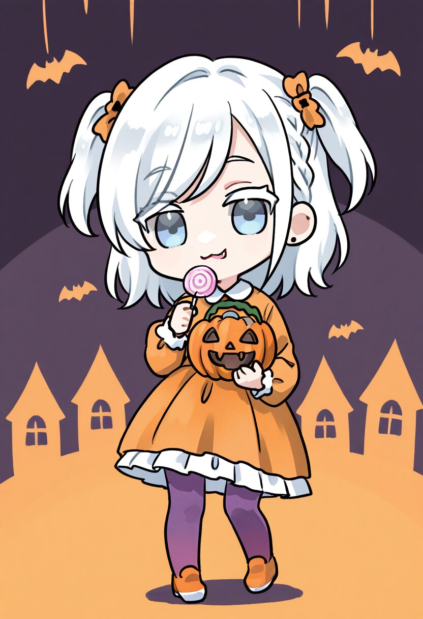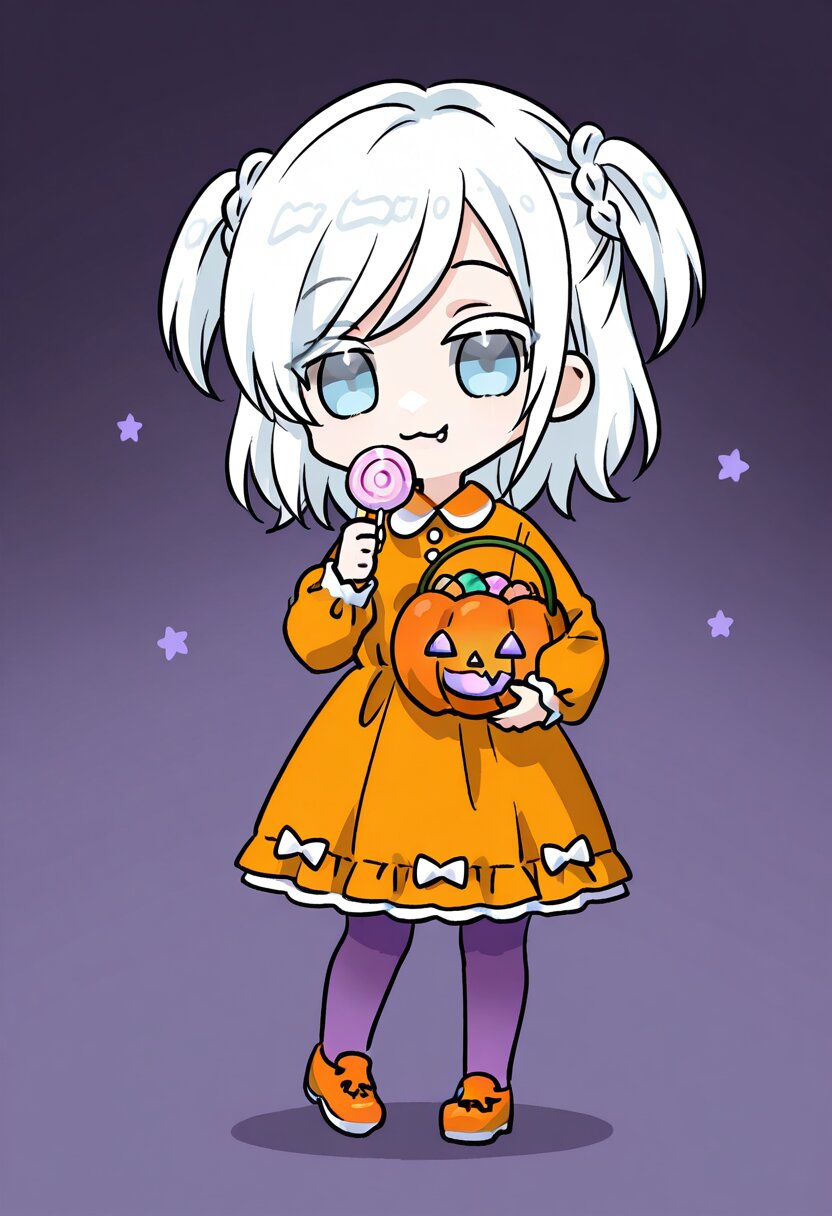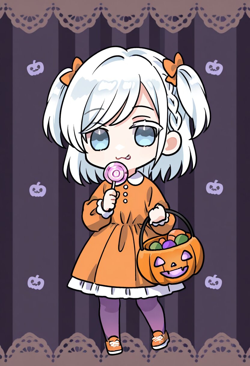 <lora:inmnstylilxl:0.8>, best quality, masterpiece, very aesthetic, watercolor painting, general, 1 girl, chibi, solo BREAK 1girl, chibi, solo, white hair, two side up, medium hair, braid bangs, swept bangs, pale blue eyes, white colored eyelashes, :3, fang, orange frilly longsleeves dress, purple tights, orange shoes, smile, licking own lips, holding lollipop, Halloween background BREAK 1 girl, chibi, solo, white hair, two side up, medium hair, braid bangs, swept bangs, pale blue eyes, white colored eyelashes, :3, fang, orange frilly longsleeves dress, purple tights, orange shoes, smile, licking own lips, holding pumpkin basket, Halloween background basket