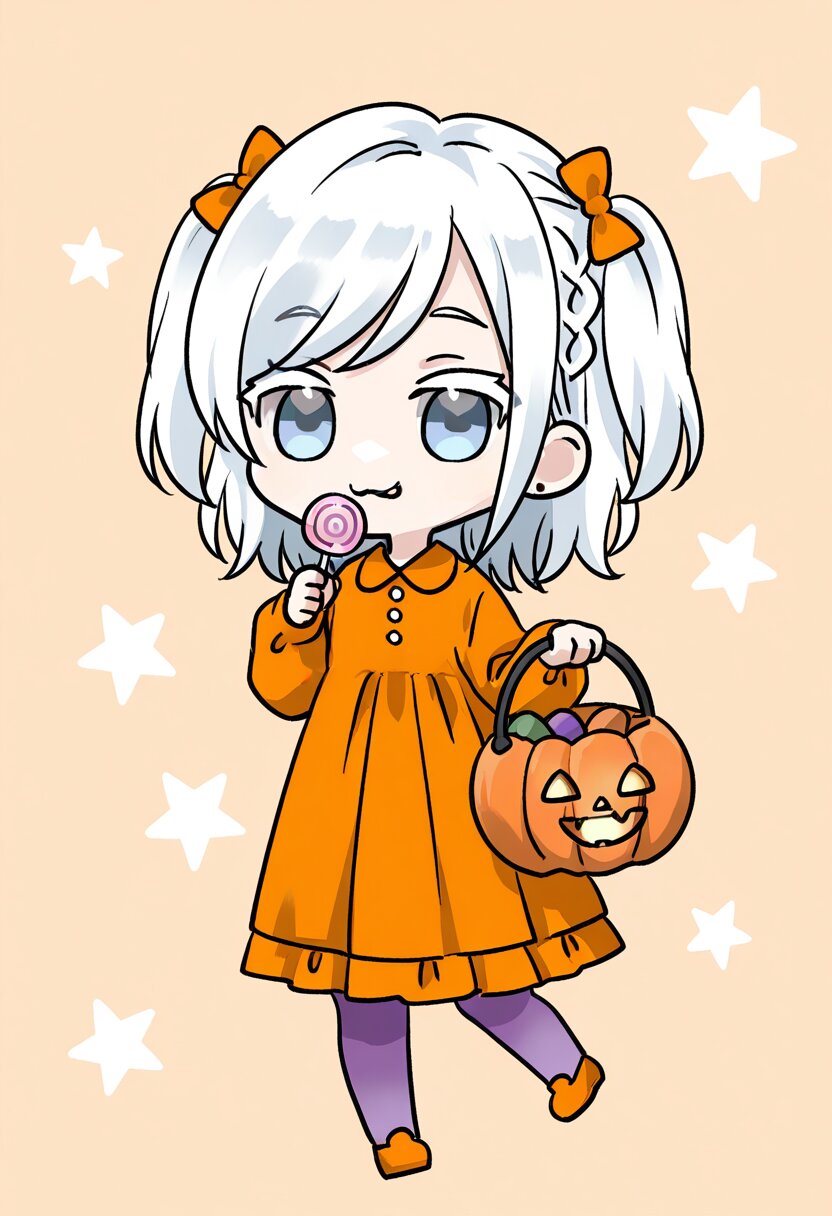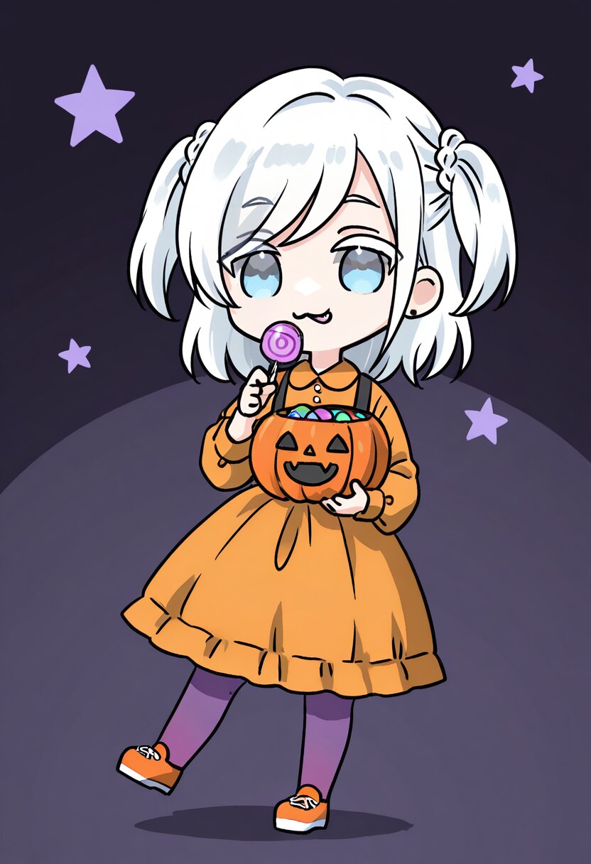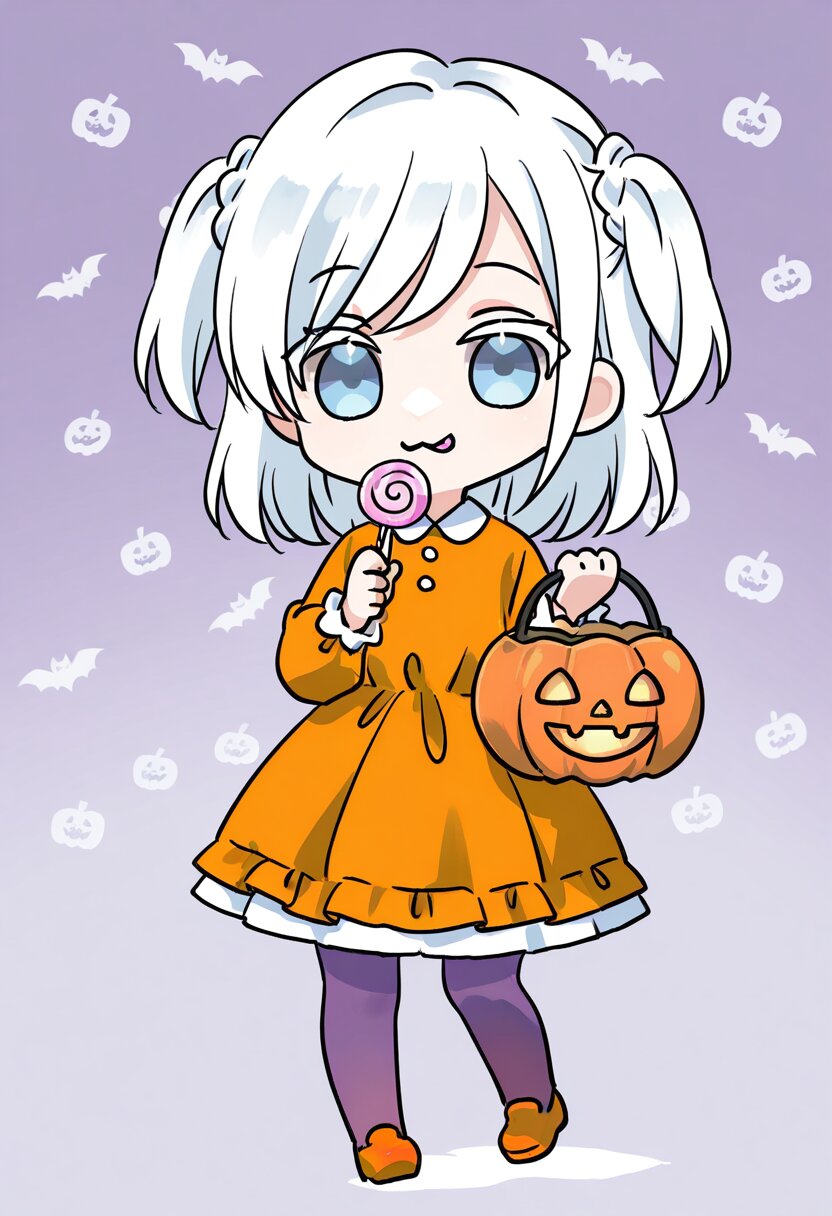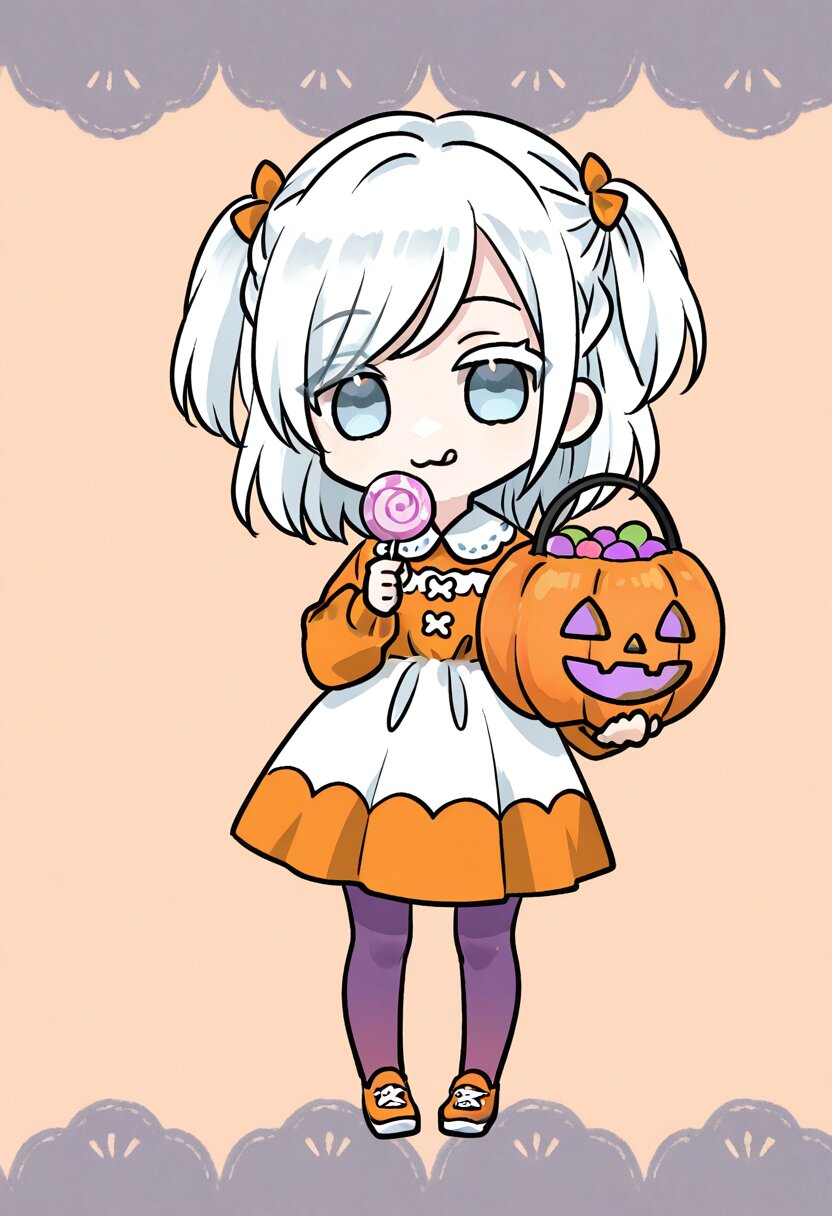 <lora:inmnstylilxl:0.8>, best quality, masterpiece, very aesthetic, watercolor painting, general, 1 girl, chibi, solo BREAK 1girl, chibi, solo, white hair, two side up, medium hair, braid bangs, swept bangs, pale blue eyes, white colored eyelashes, :3, fang, orange frilly longsleeves dress, purple tights, orange shoes, smile, licking own lips, holding lollipop, Halloween background BREAK 1 girl, chibi, solo, white hair, two side up, medium hair, braid bangs, swept bangs, pale blue eyes, white colored eyelashes, :3, fang, orange frilly longsleeves dress, purple tights, orange shoes, smile, licking own lips, holding pumpkin basket, Halloween background basket