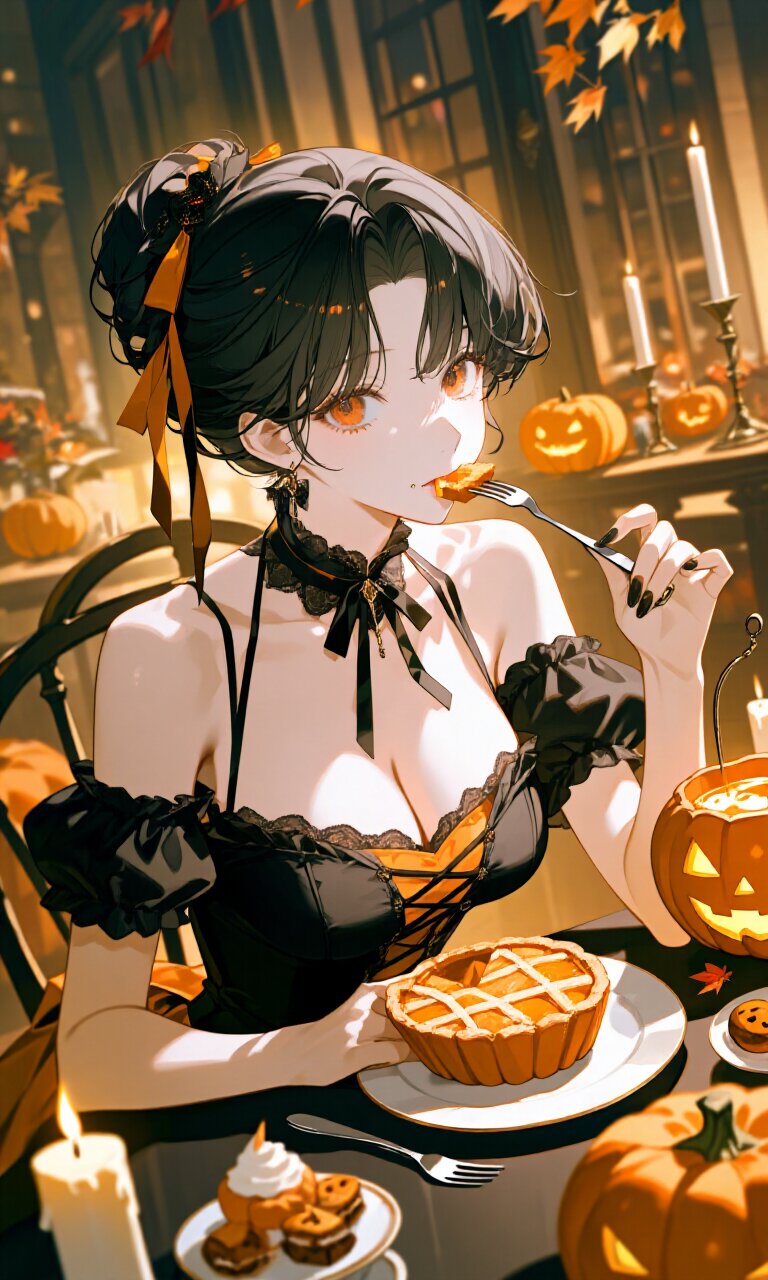 illustration for Halloween Sweets Day. A beautiful woman in an elegant Halloween dress sits at a stylishly decorated table. She is enjoying a bite of pumpkin pie with a fork, her expression graceful and content. On the table are a chic plate, a pumpkin-shaped mug filled with a warm drink, and small Halloween sweets arranged neatly. The atmosphere is cozy yet sophisticated, with gentle candlelight and soft orange glow illuminating the scene. Her Halloween dress is black and orange with lace and ribbon details, exuding both beauty and festive charm. The background hints at a warm, softly lit café or party space decorated with pumpkins and autumn leaves. high quality, anime style, cinematic lighting, detailed textures, warm and elegant atmosphere, 4k digital painting