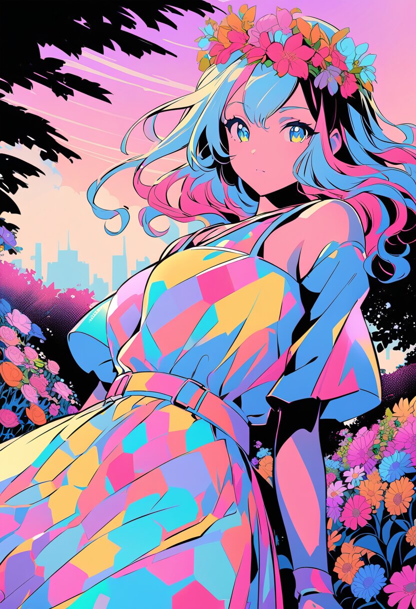 masterpiece, best quality, beautiful detailed eyes, ultra-detailed, finely detail, highres, perfect anatomy, colorful, Kyoto Animation city pop, 1 girl, solo, simple background, retro style, (1990s city pop art style), (city pop anime), retoro anime,1990s fashion, vivid colors, RETRO ART STYLE, NEON_POP ART STYLE, flat color, (flower crown), (flower garden), polka dot dress, sky, ,