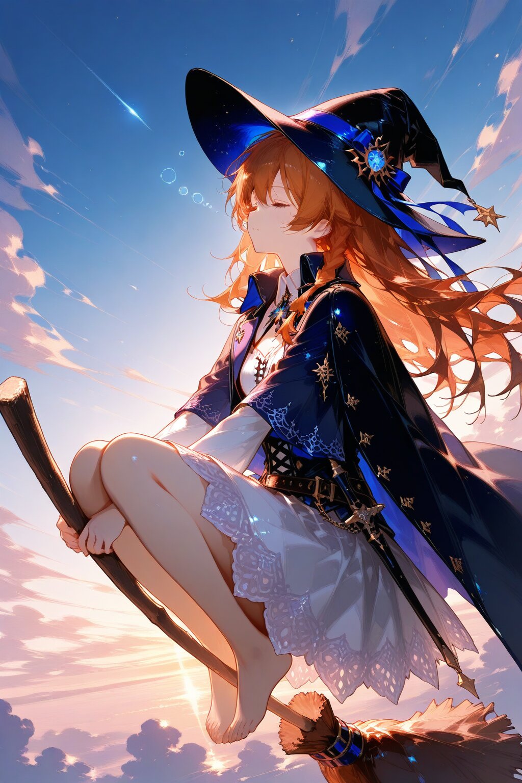 (best quality),(masterpiece),(ultra detailed),1 girl,(witch on broom, flying sky), sleepy, from above