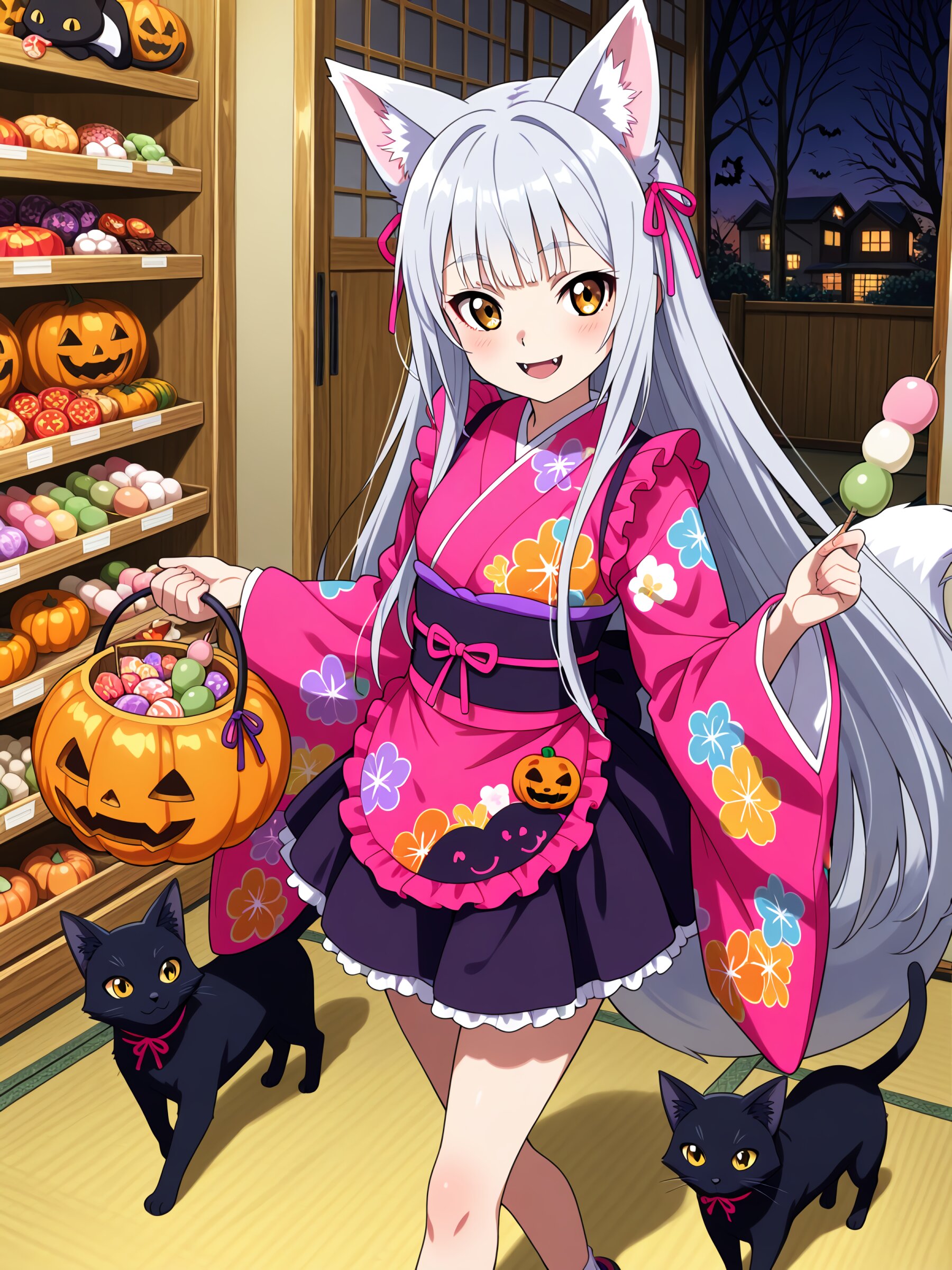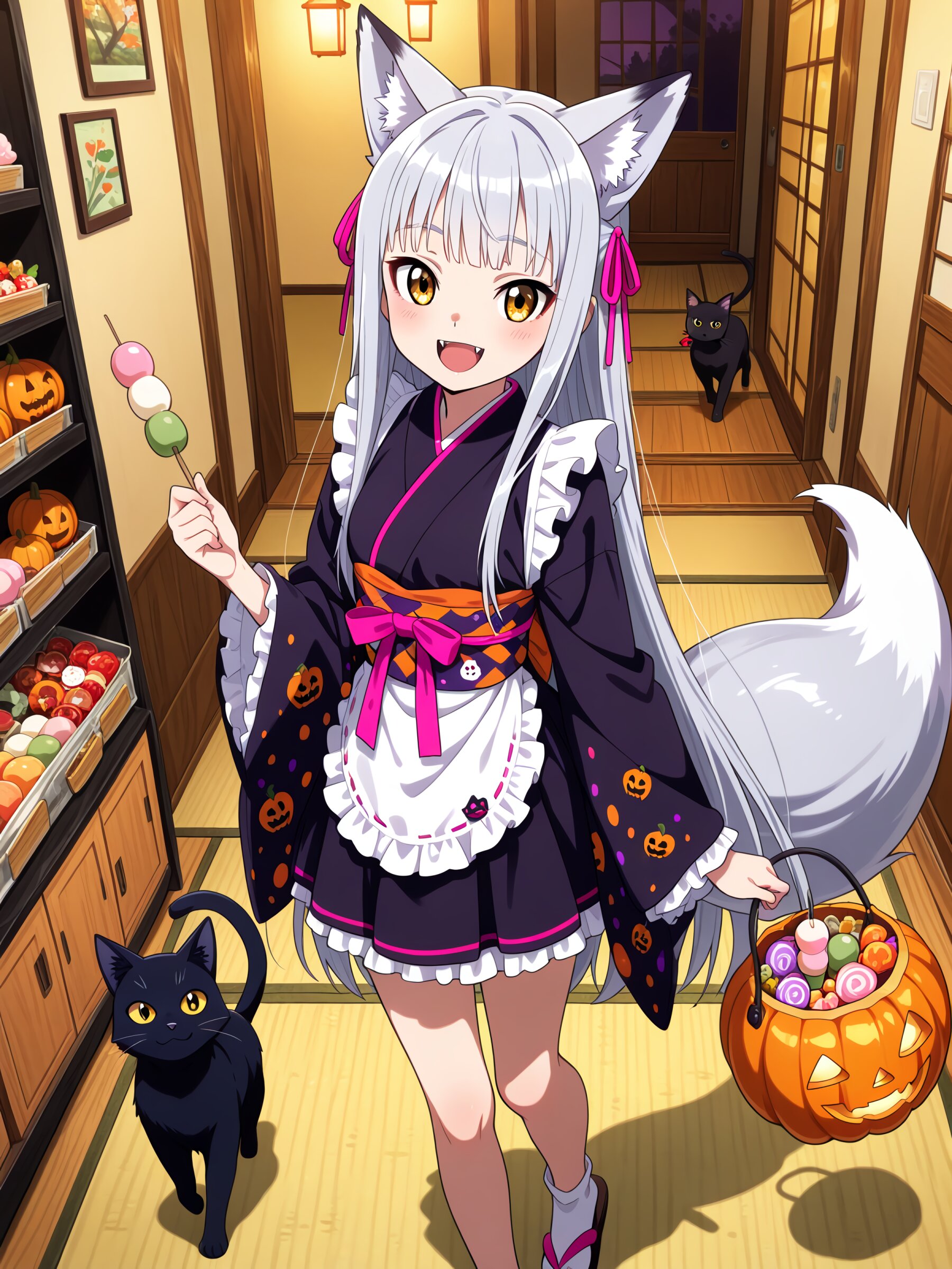 (1girl), ((short height)), ((silver hair)), ((very long hair: 1.2)), straight hair, tidy hair, golden eyes, golden eyes, fangs, small breasts, slender, ((bangs)), aligned hair, aligned side hair, small, girl, child, fox ears, silver fox tail, japanese-style maid outfit, kimono with cute and colorful halloween pattern, pumpkins, smiling jack-o-lanterns, black cats, bats, candy, bright orange, purple and black colors, playful and cheerful design, frills and ribbons accents, vibrant and festive, frills, mini skirt, walking, in a traditional wagashi shop, holding colorful dango, halloween decorations around, pumpkins, warm autumn lighting, playful and cheerful expression, detailed background, vibrant colors, festive halloween mood, tatami floor, shoji doors, wooden shelves, traditional sweets display, soft shadows, whimsical atmosphere, kawaii style, (newest, anime, animation, anime screen capture, anime style), (masterpiece, vibrant, very aesthetic, highly detailed, best quality, 16k), Perfect hands, perfect fingers,