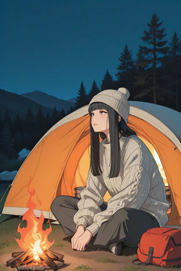 (best quality),(masterpiece),(ultra detailed),1 lady, long hair,black hair, blunt bangs, (knit cap), ((camping)), night, fire