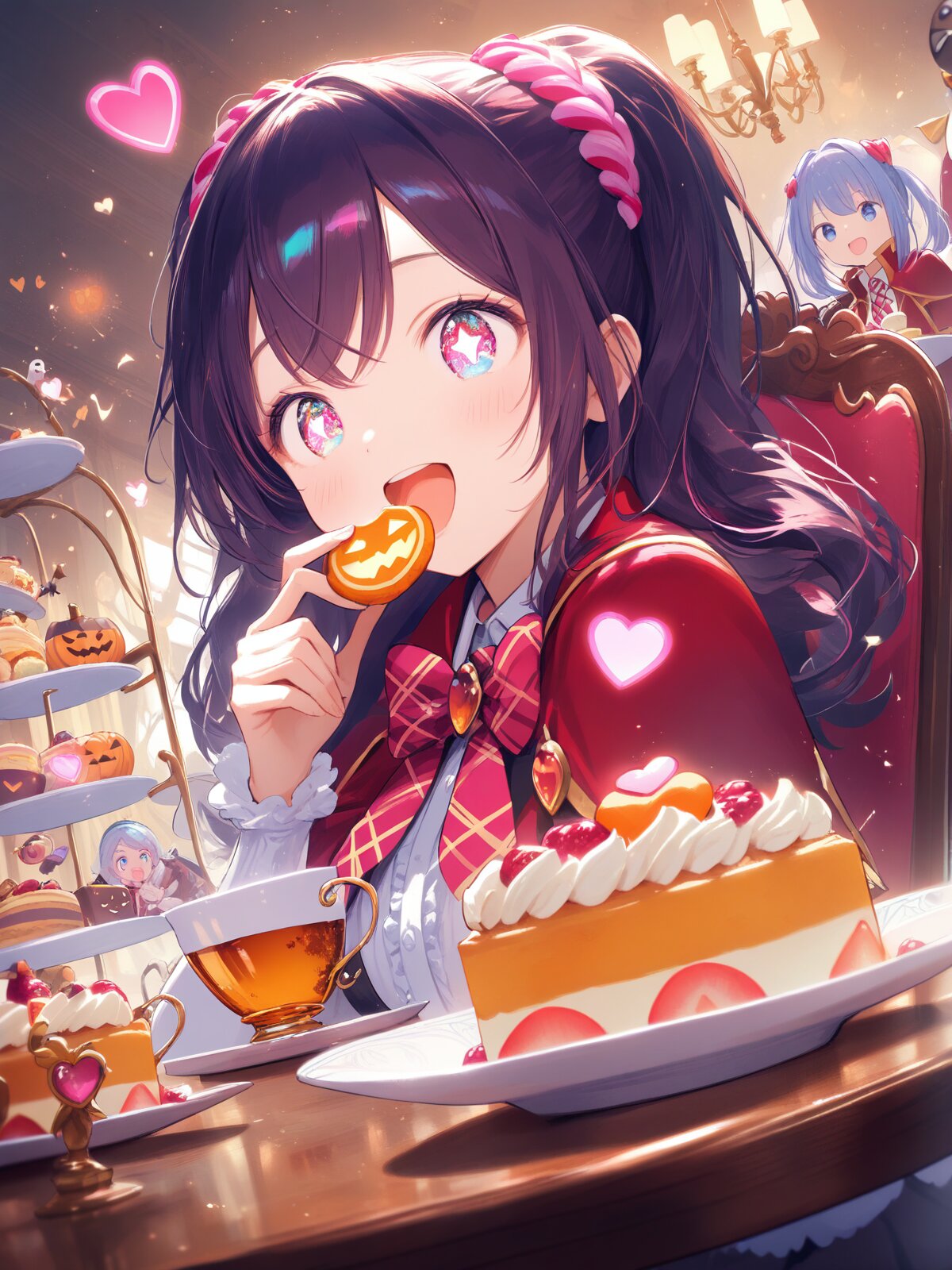 table, chair, Elegant tea time, eating sweets, dessert, magic school party, happy, Halloween, open mouth, heart, friends, girls,
