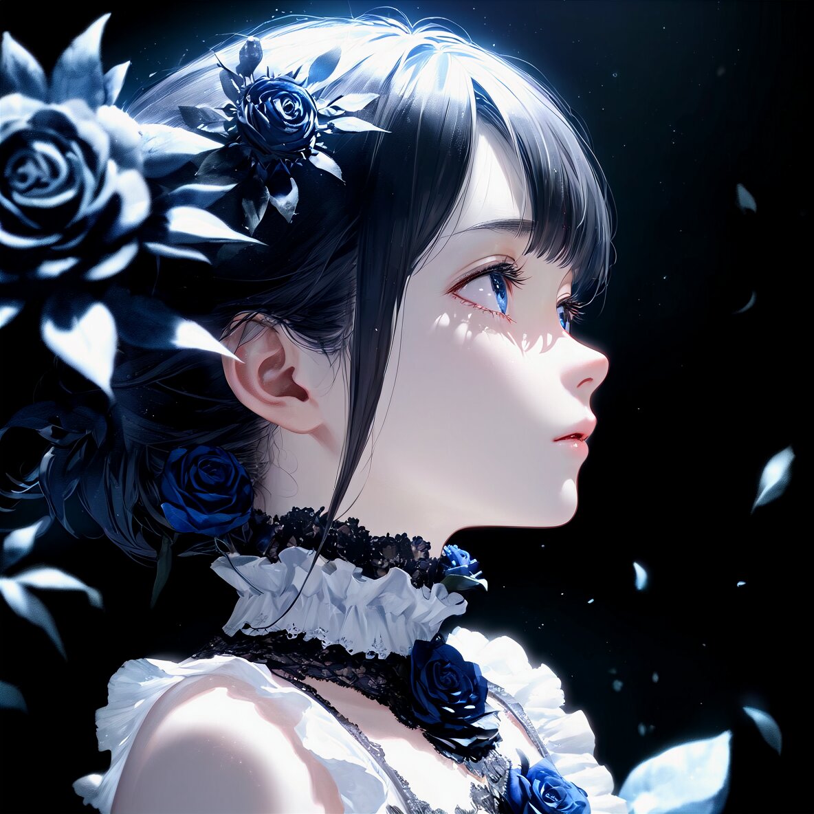 ((best quality,high resolution,ultra-detailed,dynamic lighting,official art,realistic,extremely detailed CG,)) ((profile,)big eyes,white skin,)sadness,white frill dress high neck,accesary,small gear and black dry flower head ornament,epicene,(looking up,)lower eyes,dry flower background,botanical hall crock background with black roses,blue bouquet,((face close up,perfect face,))