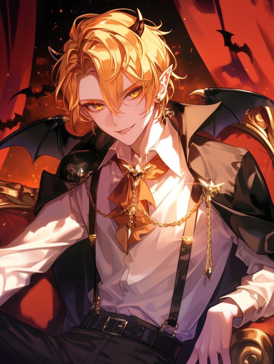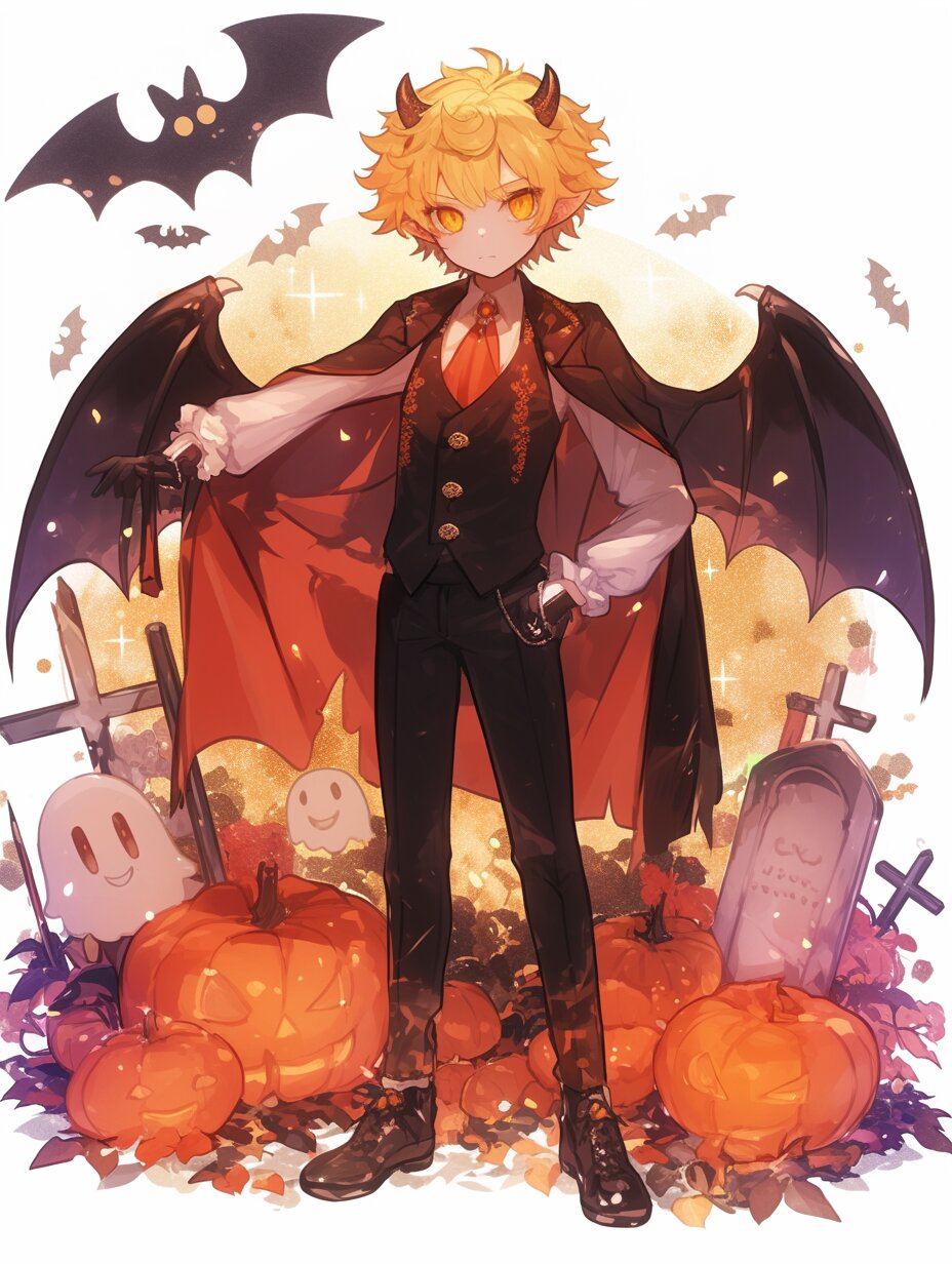 威風堂々とした角っ子くんが、最高のハロウィンナイトを統治しているような迫力です!🎃🦇🌕 玉座と蝙蝠の翼、赤い瞳とマントが織りなすダークファンタジーな世界観が最高にクール!ジャック・オ・ランタンとお化けに囲まれたミステリアスな雰囲気にゾクゾクします!✨🙏