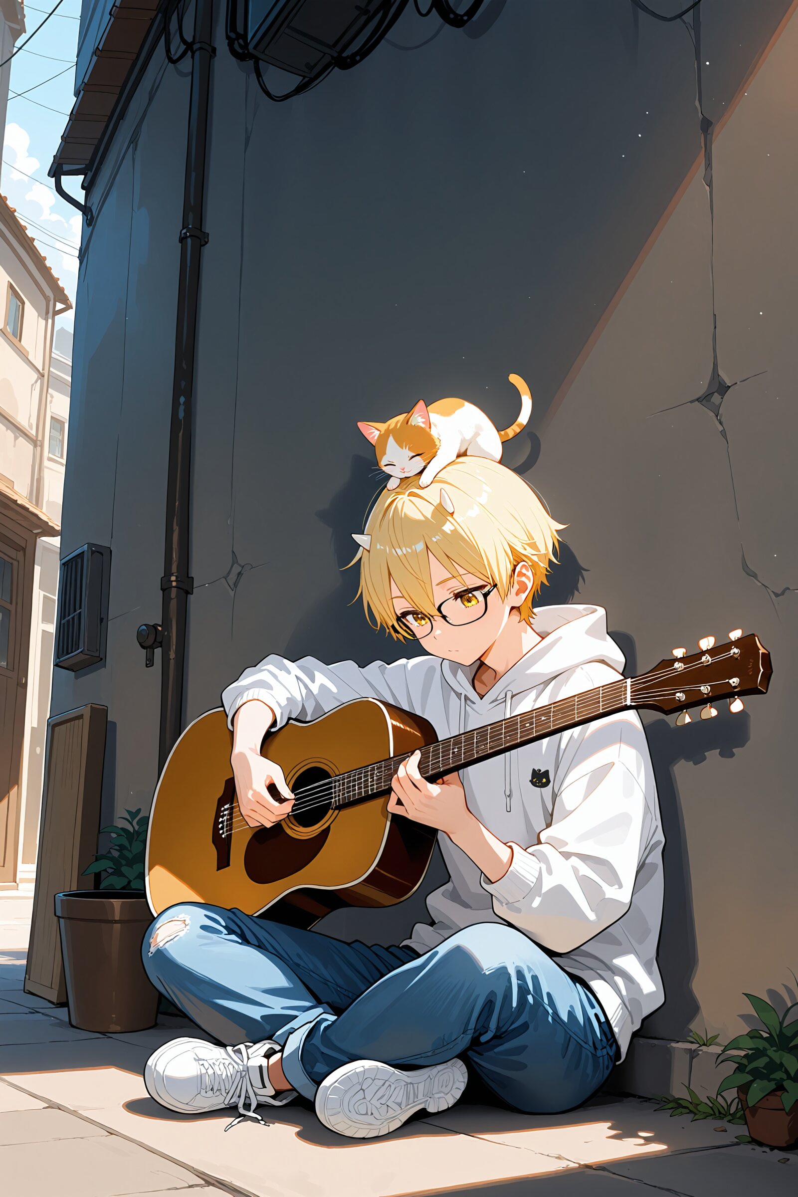 路地裏でギターを弾く、ストリートミュージシャン風の姿が新鮮で素敵です!🎸✨ パーカーにジーパンというカジュアルなスタイルと、頭の上で寛ぐ猫ちゃんの組み合わせが、とっても平和で癒やされますね🐈💕 優しい日差しの中、どんな曲を奏でているのか想像が膨らみます!🙏