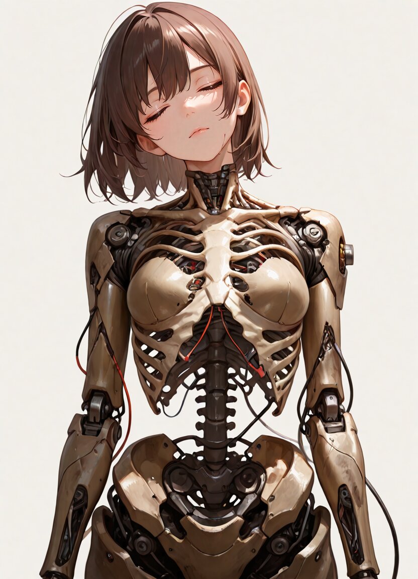 simple background, 1girl,solo,cyborg,damaged,mechabare,skeleton,ribs,cable, tube, breasts,torn skin , closed eyes, brown hair, head tilt, facing viewer, cowboy shot,, appropriate posture,appropriate configuration,ideal ratio body proportions,perfect anatomy, <lora:Fixhands_anime_bdsqlsz_V1:1>, masterpiece,best quality,newest,absurdres,highres,ultra high res,8K UHD,hyper-detailed,