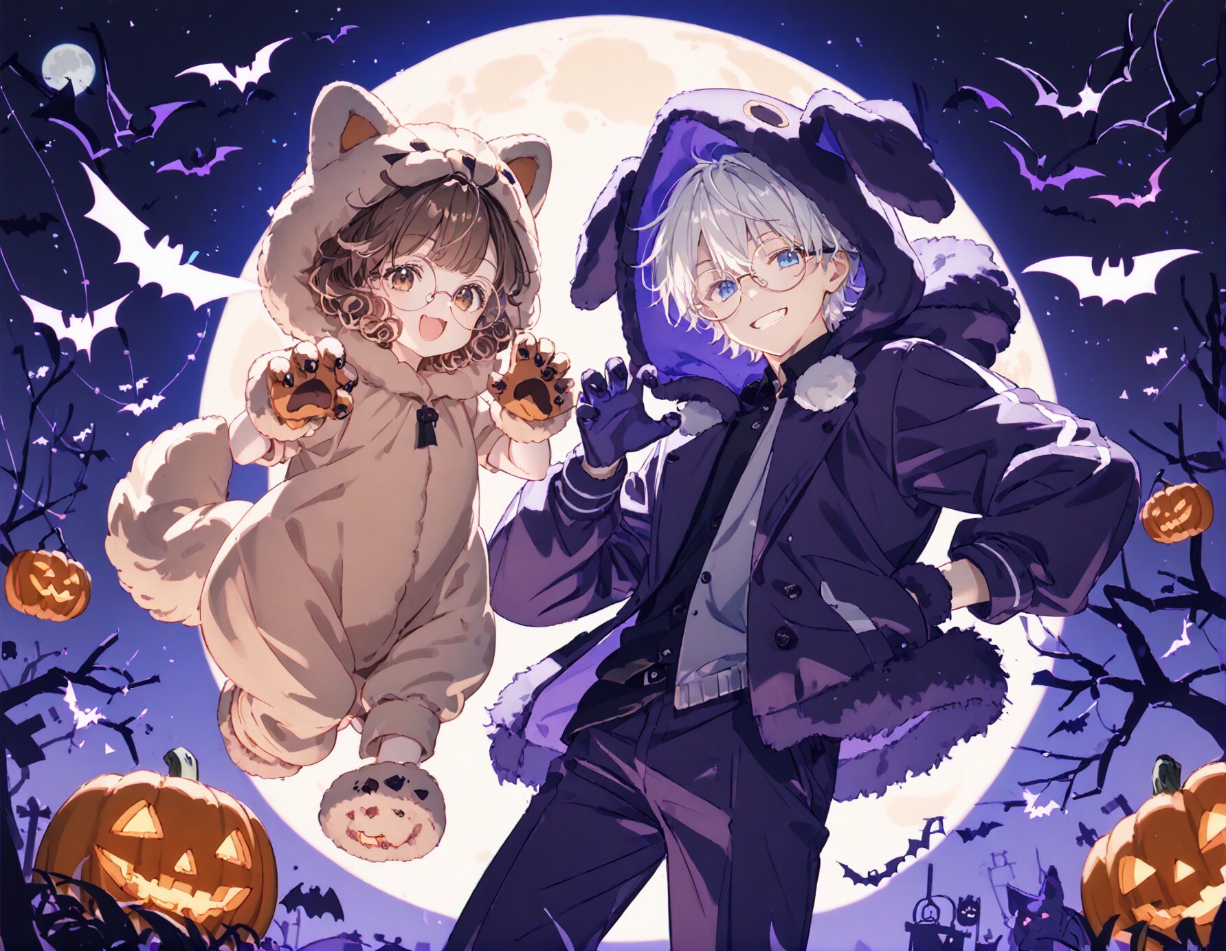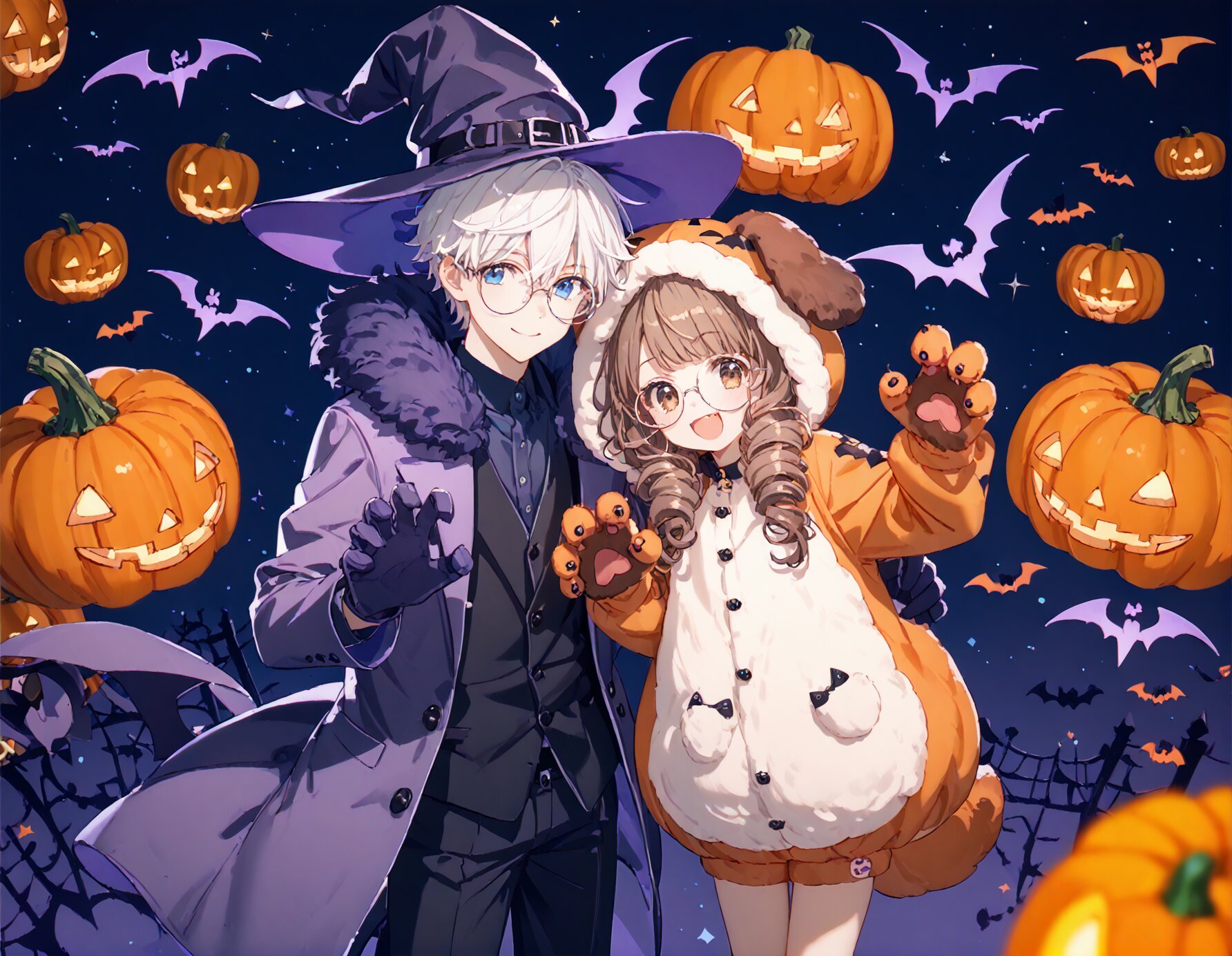 1boy and 1girl, score_9, score_8_up, score_7_up, score_6_up, score_5_up, score_4_up, rating_safe, masterpiece, best quality, high quality, highres:1.0, ultra detailed, incredibly absurdres:1.0, textuer:1.0, source_anime:1.0, resized, vivid colors, perfect composition, (perfect anatomy:1.3), (Halloween Theme:1.3), cowboy shot, 1boy, (white hair), (short curly hair), (blue eyes), witch hat, big round glasses, witch costume, (orange and purple theme), 1girl, detailed face, (smile showing her tooth), (brown hair), brown eyes, full body, Claw Pose, (Fluffy fleece dog hood full suit Costume ), (fluffy fleece dog gloves), (Fluffy fleece dog slippers that wrap foot), Jack-o'-lanterns, flying bats, night time, moon lighting,