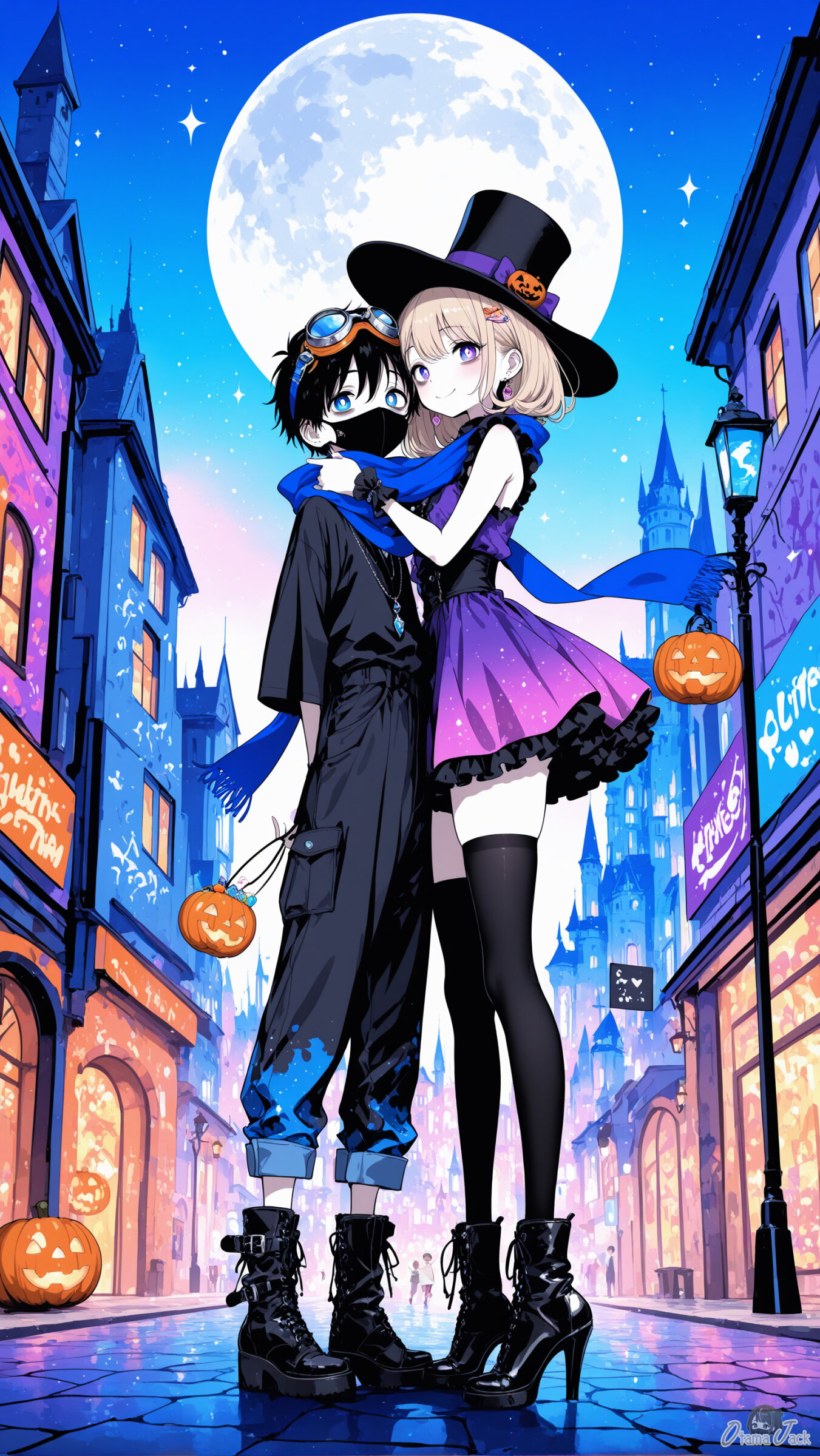 1 girl, (1 boy, Boy, shota,little boys, young child, faceless boy, small boy, height difference,), shared scarf,cheek-to-cheek, polyurethanemask, mouth mask, top hat, goggles on headwear, Orange and purple dress, frilled dress, sleeveless dress, black legwear, zettai ryouiki, high heel boots, black black footwear, outdoors, castle, full moon, halloween, jack-o'-lantern, BREAK v over eye, +++,happy trance, halloween city, street, graffiti, urban, blue sky, neon, (watercolor background:1.6),chromatic aberration,pastel color,colorful,