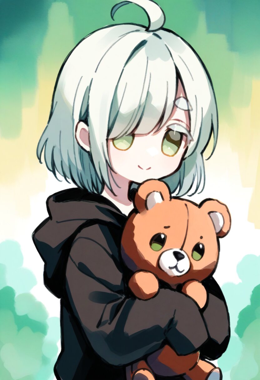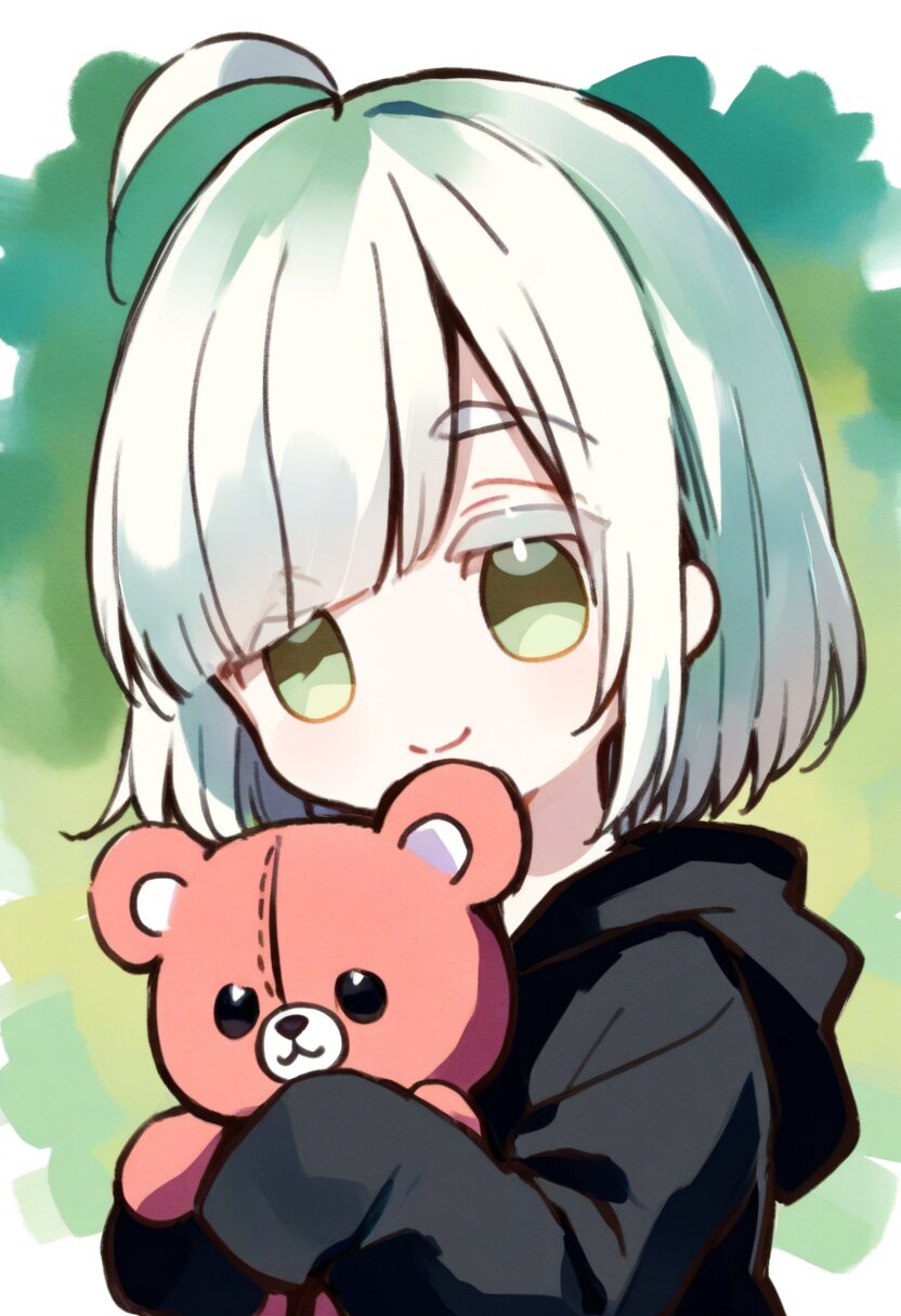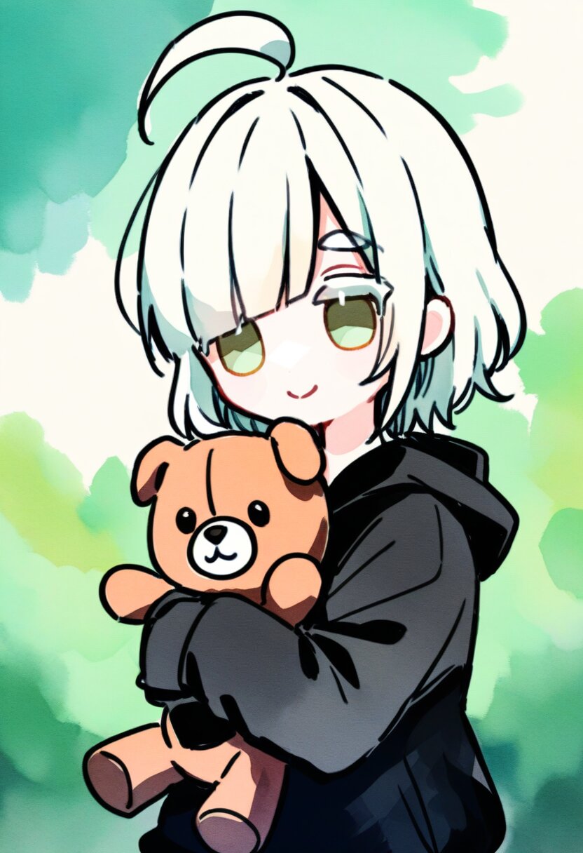 <lora:inmnstylexl:1>, best quality, masterpiece, very aesthetic, watercolor painting, general, 1 girl, chibi, (bright white hair), short hair, blunt bangs, white thick eyebrow, white colored eyelashes, (hair over one eye), ahoge, mintgreen eyes, oversize black hoodie, sleeves past wrists, smile, hugging teddybear, upper body
