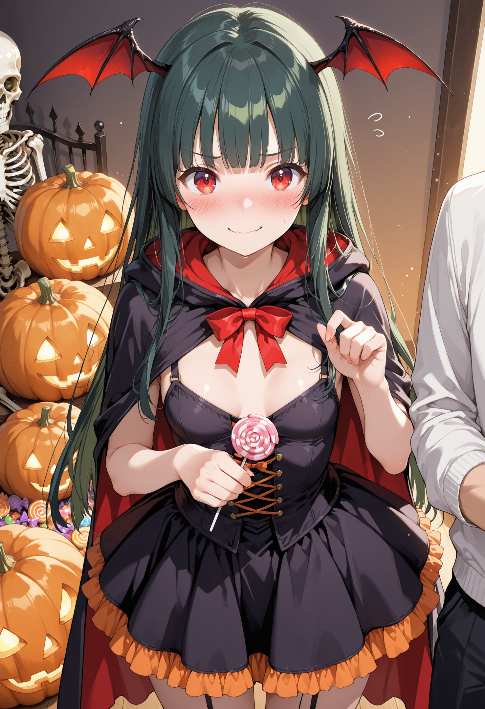 (masterpiece, best quality, ultra-detailed, dynamic pose, expressive emotion), couple, 1girl, 1boy, halloween costumes, female: dark green hair, long hair, hime cut, red eyes, small breasts, embarrassed expression, blushing, short Cape, cute bat-themed halloween outfit, frilly skirt, holding candy, male: wearing skeleton hoodie, grinning playfully, teasing pose, pumpkins, candy scattered around, fun and playful halloween scene, warm lighting