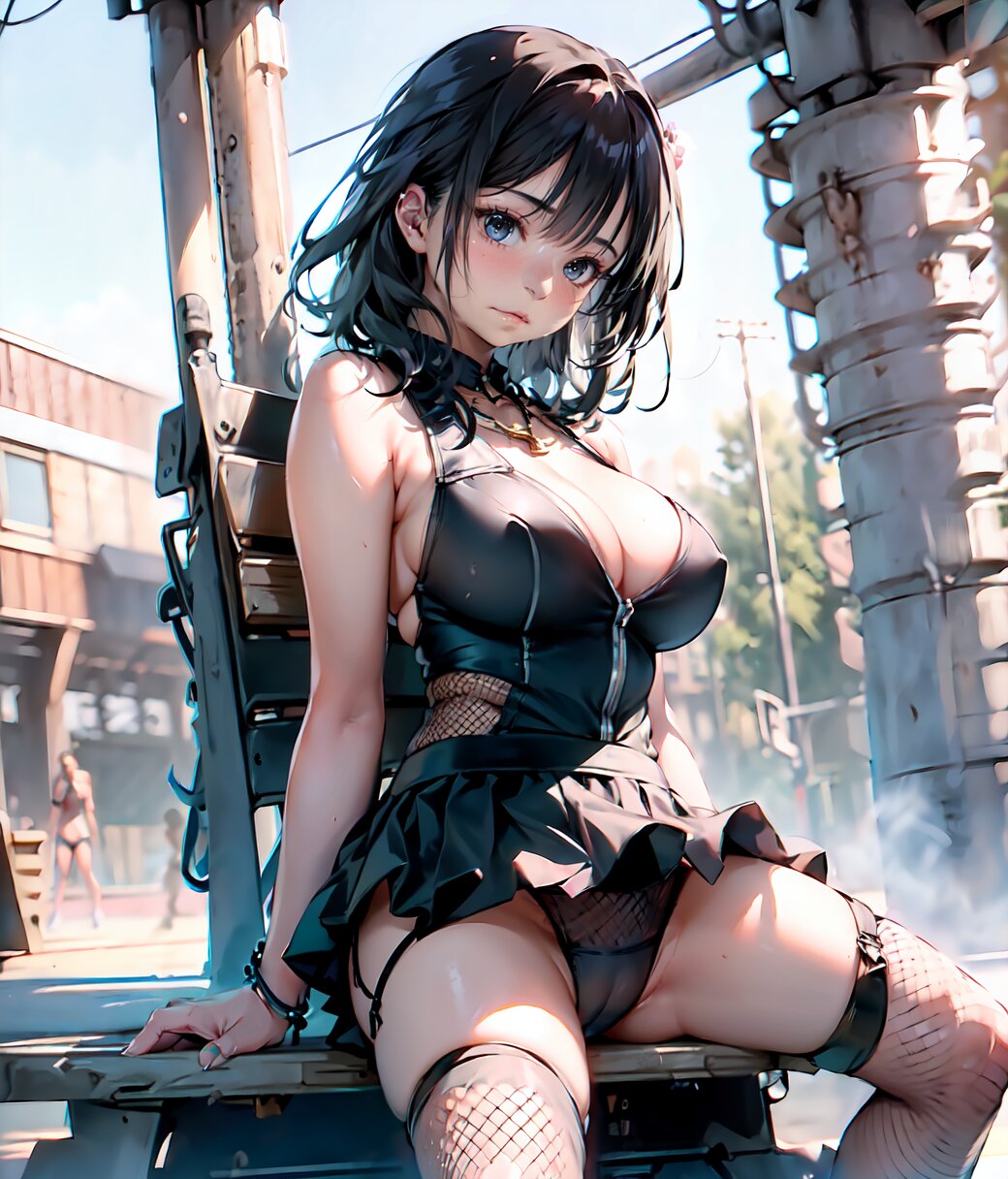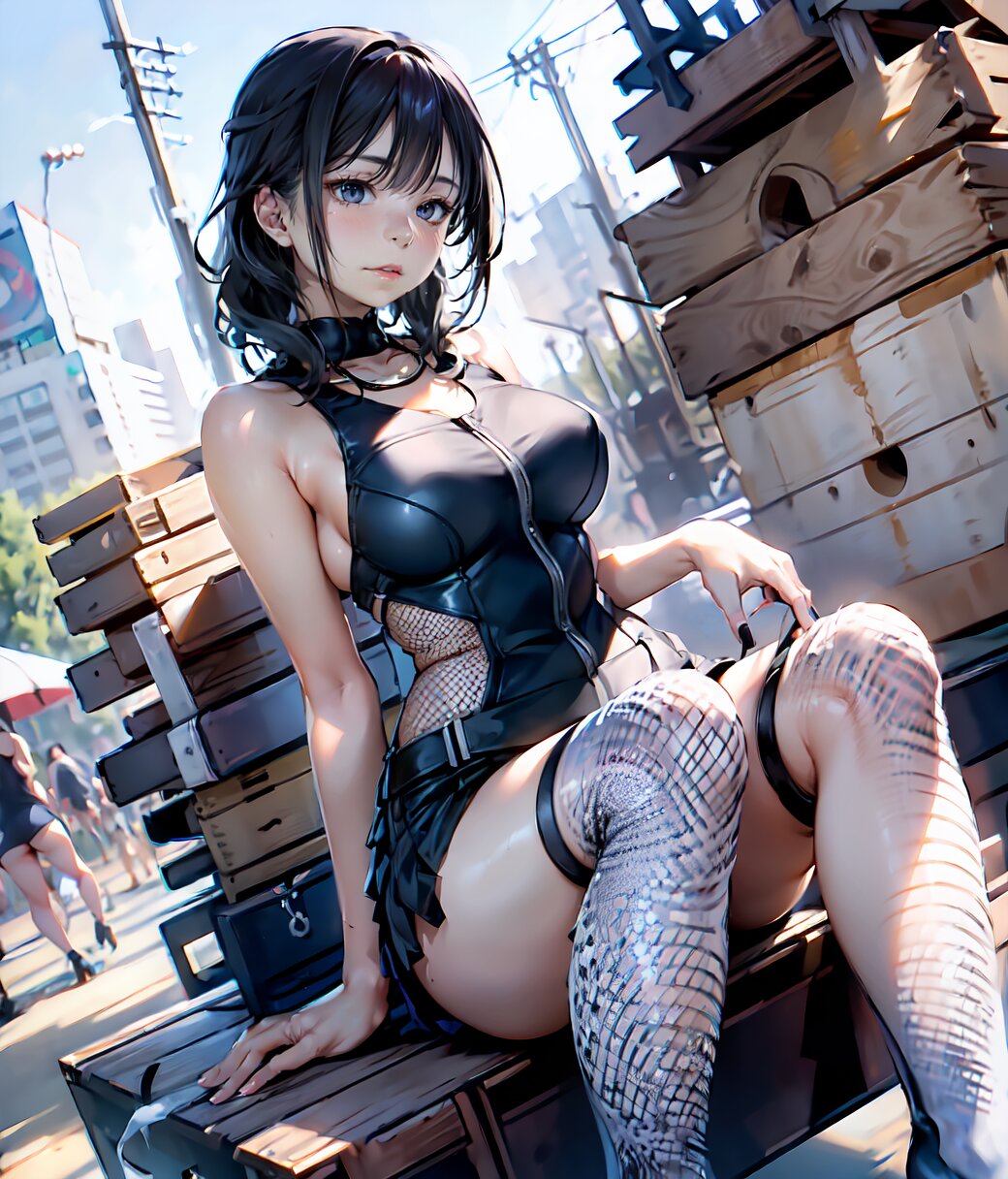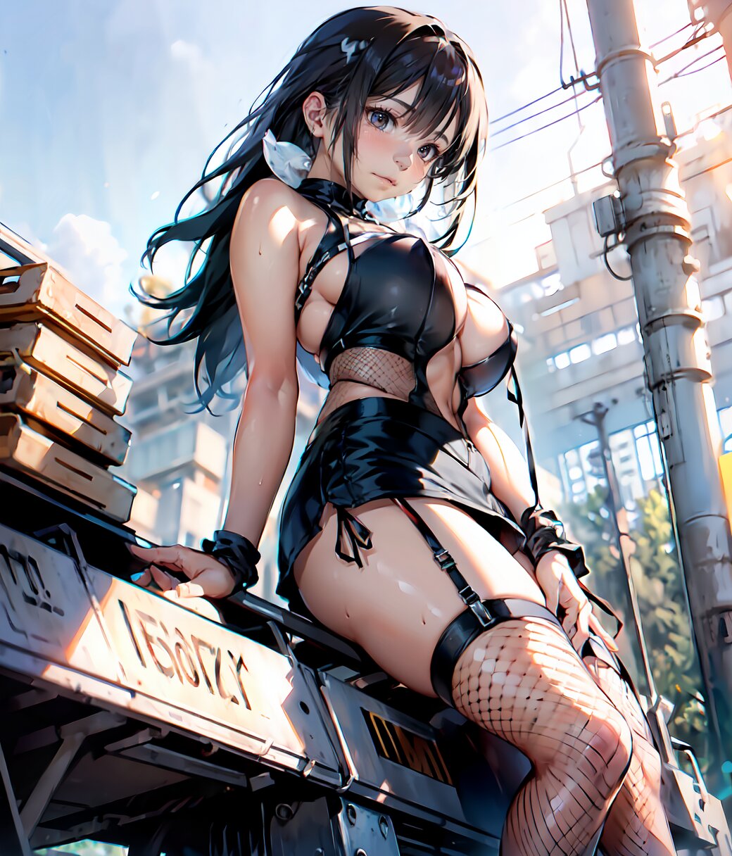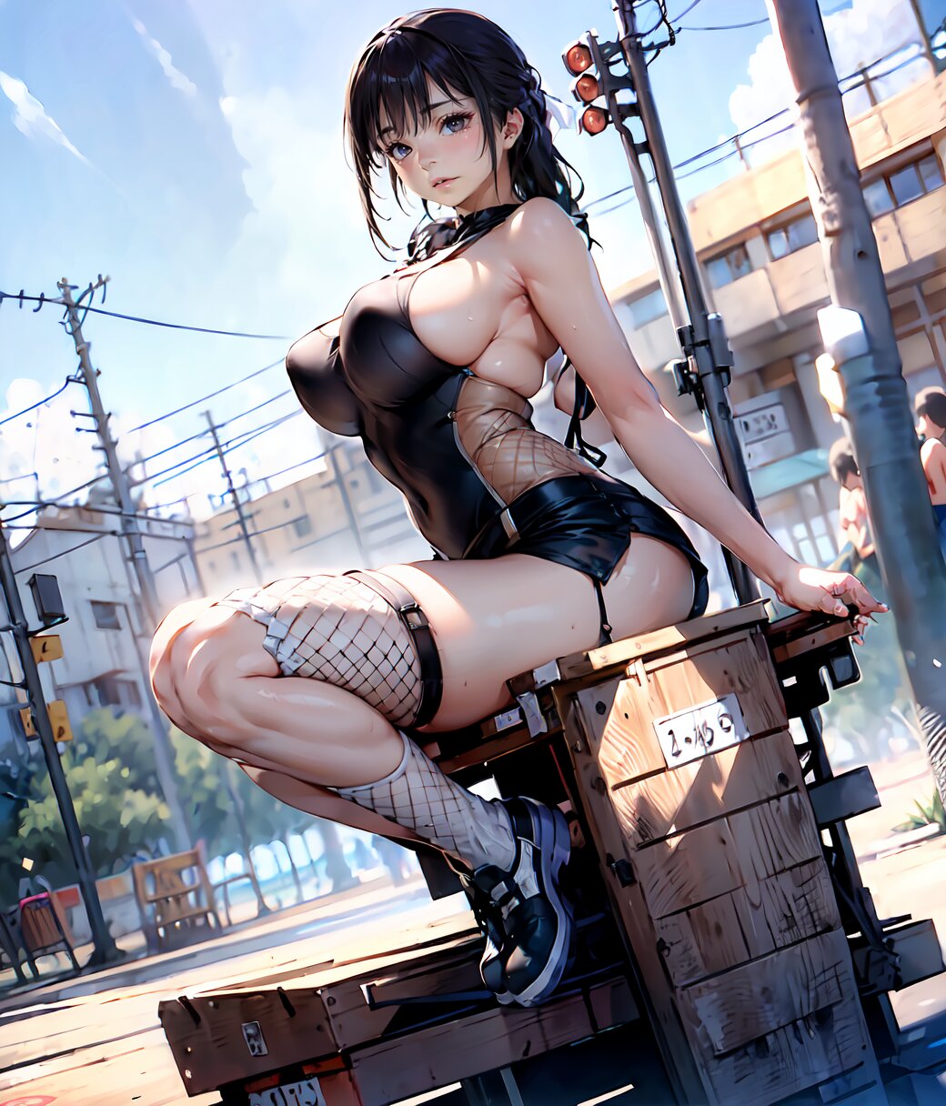 (8k, Ultra Hi-Res, top quality, Masterpiece: 1.2), RAW photo, (Photorealistic: 1.4), professional lighting, (from below: 1.2), full body, 1girl, 18 years old, (((huge breasts))), bare shoulders, gold necklace, (((detailed Top And Ruched Bodycon Mini Skirt, fishnet black thighs, black sexy panties))), show breasts, curvy, depth of field, cinematic lighting, (physical-based rendering), (sexy posing, sitting on load, leaning back: 1.4), in the summer beach, <lora:Uta_v01:1>
