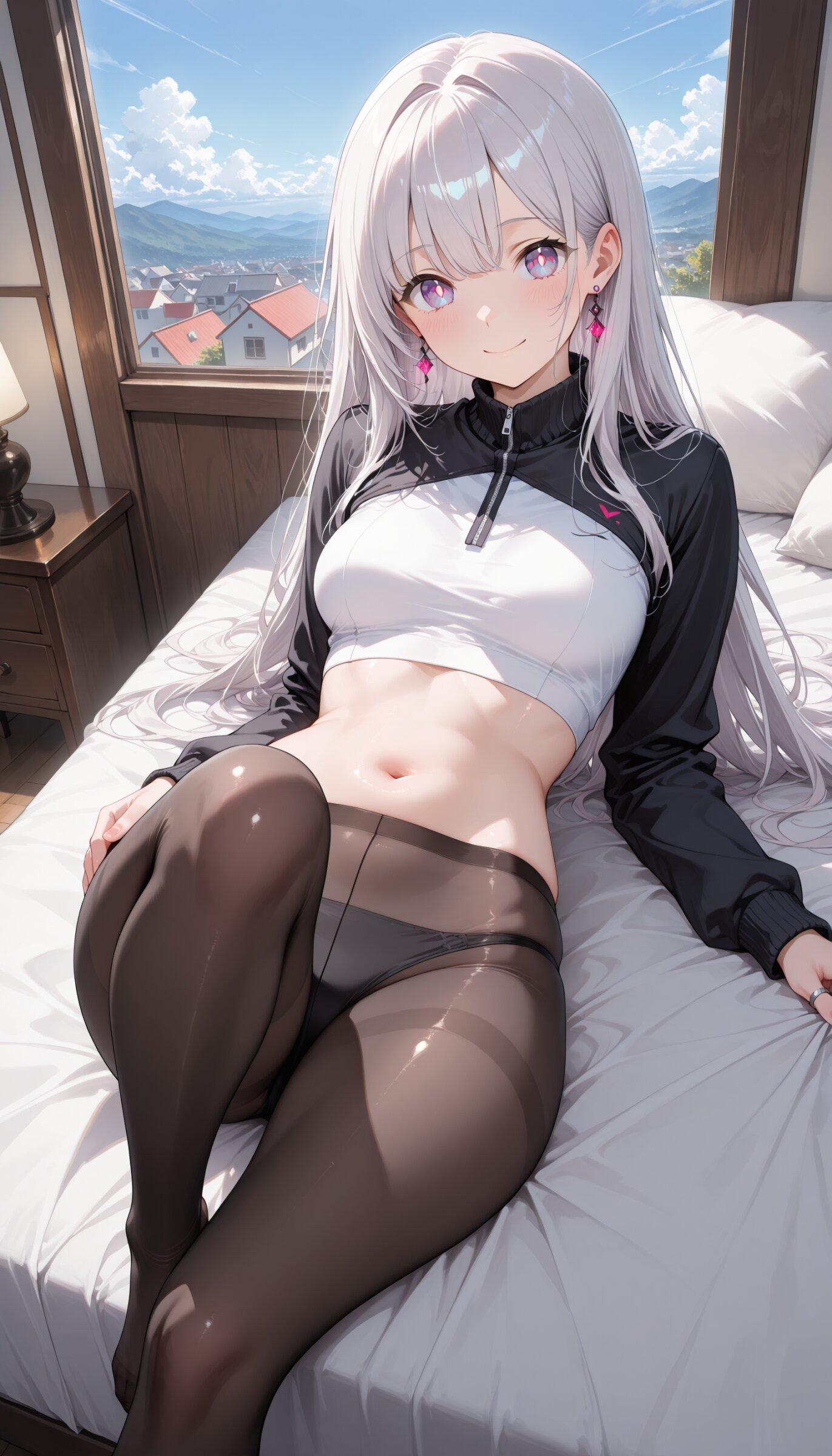 1girl, Long hair, white hair,less pink highlights, pink pupils,rings,medium breast,see-though,earrings,头上黑色蝴蝶结,8K,thighs gap visible through clothes,smile,lying on bed,from above,sunshine,above clouds,wooden room, (Floor-to-ceiling windows:1.2),in bed,stomach, looking at viewers,detailed pantyhose,perfect tigh,full shot,touge out,from above, (perfect body), (nice hands), (sharp focus),(perfect hands), perfect face, perfect eyes, skin indentations, shiny skin, (intricate:1.2), (anime coloring:1.5), high contrast, (masterpiece:1.2), (best quality:1.2), (very aesthetic:1.2), (absurdres:1.2), (detailed background:1.5), newest, (beautiful detailed eyes:1.2), beautiful, amazing, (intricate details:1.2), ,cinematic angle, color detail, Depth of field, long exposure, vibrant colors,cinematic angle,color detail, Depth of field, long exposure,Composition, foreshortening, positioning, pose, improved pose,body composition, facial expression, expression, masterpiece, sharp lines,,(leg up:1.4), knee up,sitting,long_legs,(leg up:1.4), knee up,vivid colors,
