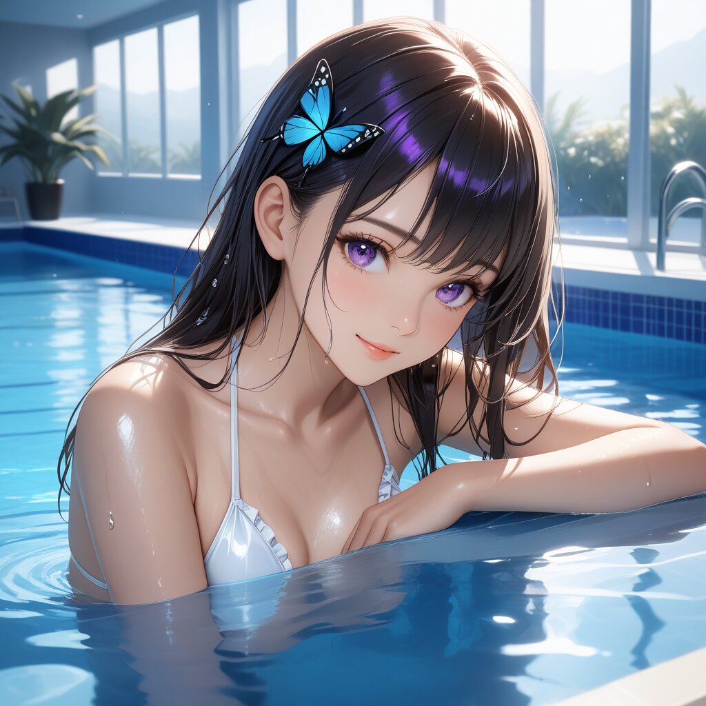 masterpiece, best quality, ultra high resolution, absurdres, photorealistic, intricate details, extremely detailed, stunning clarity, volumetric lighting, glossy finish, highly reflective skin and material, 1girl, solo, (upper body to waist shot:1.2), reclining on the edge of a swimming pool, leaning on her arms, looking at viewer, gentle smile, alluring gaze, delicate facial features, long dark hair, butterfly hair ornament, (purple eyes:1.1), small breasts, shiny white bikini, frilled bikini bottom, wet skin, glistening water droplets, clear blue swimming pool water, reflections on water, bright indoor pool environment, large windows in background, sunlight pouring in, cinematic lighting, soft shadows