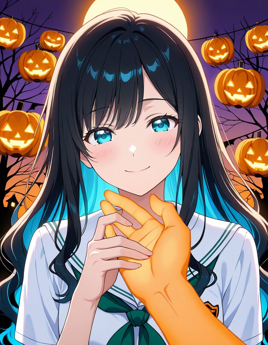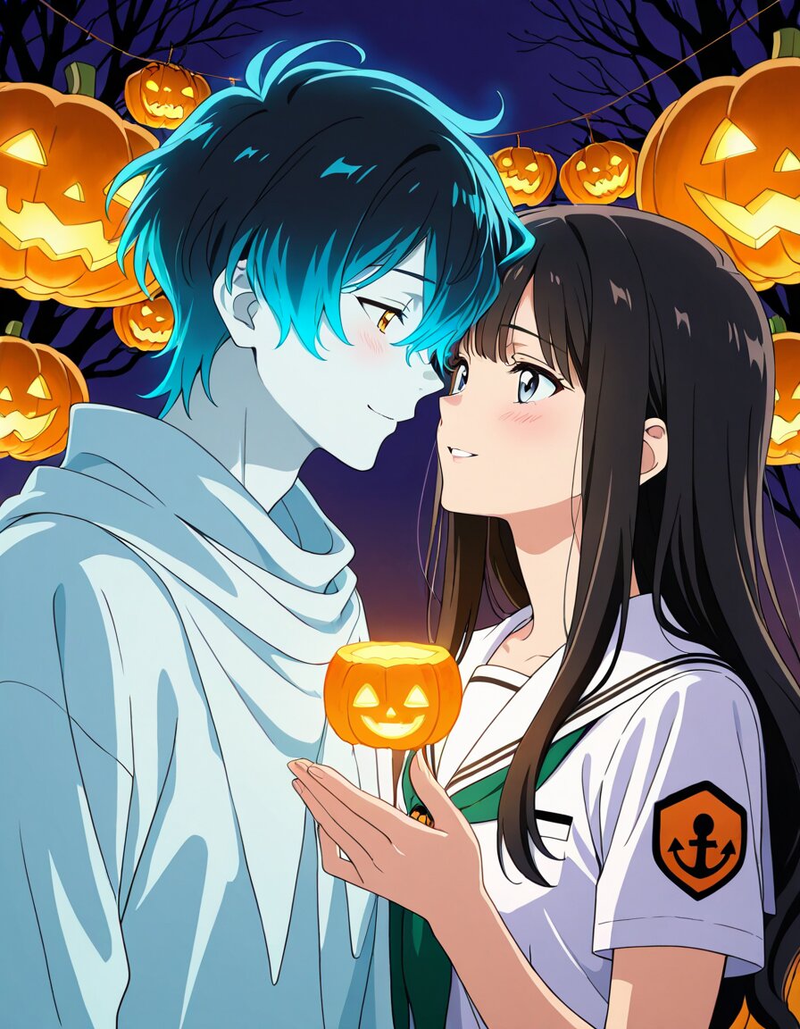 A cool and intelligent senior girl with long black hair stands close to a semi-transparent ghost boy during a magical school festival held on Halloween night,shown in a close-up from the chest up., Her long hair sways gently,reflecting the warm light of floating pumpkin lanterns,while she softly reaches out her hand toward him,her fingertips stopping just before touching his fading form., She wears a white sailor uniform with a deep green neckerchief and an orange school emblem,her calm yet emotional eyes filled with unspoken feelings., The ghost boy has short wavy hair and a faint blue glow surrounding his transparent body,his form shimmering like mist and fading around the edges,a tender and sorrowful smile on his face as he looks at her., They face each other under the gentle light of magical stalls and drifting lanterns,their shoulders almost touching,surrounded by a harmony of warm orange and cool blue tones., The scene captures the beauty of a fleeting love that can only exist during this enchanted Halloween night., Cinematic lighting,anime art style,highly detailed facial expressions,romantic couple close-up,emotional and melancholic atmosphere,Halloween fantasy setting.,