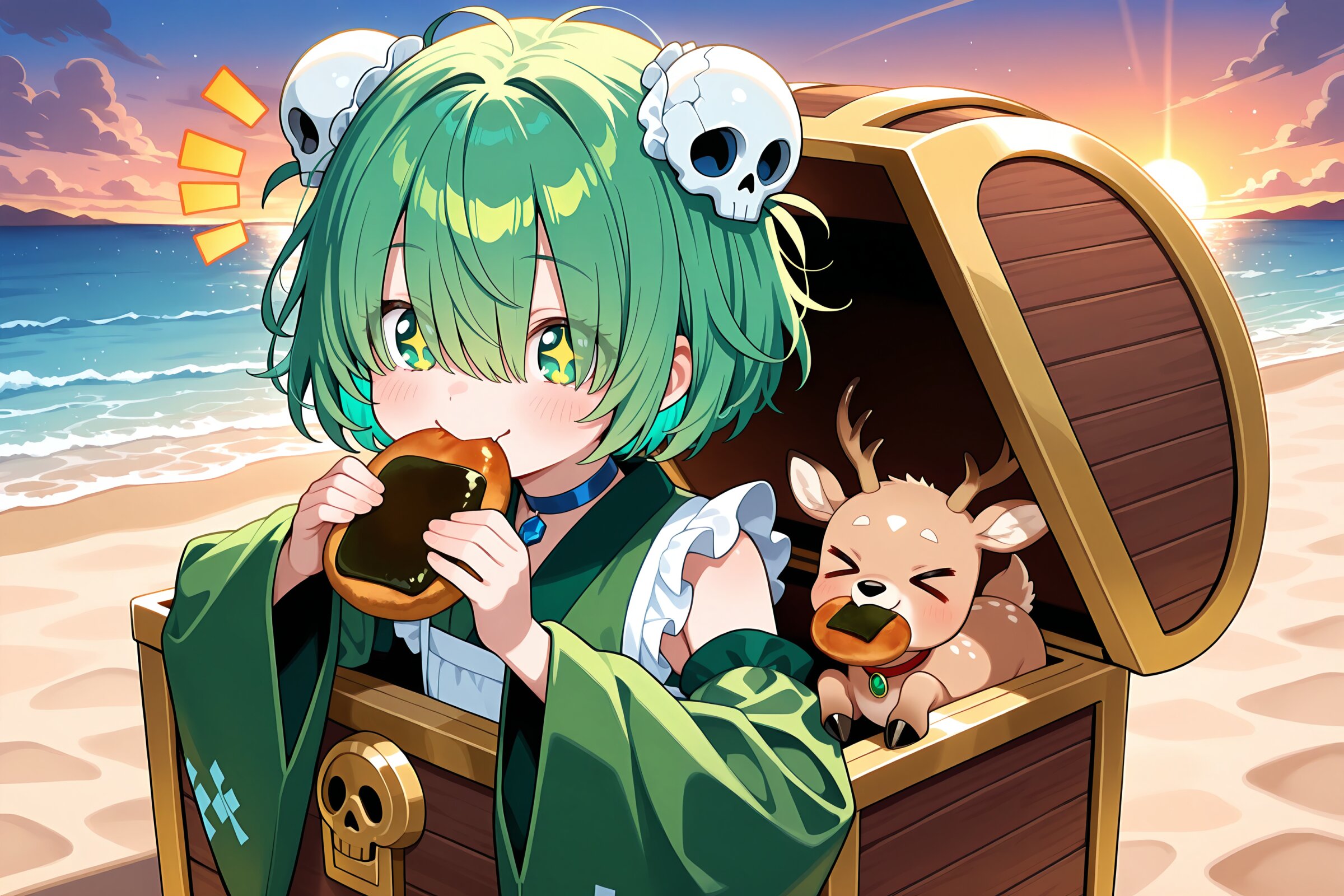 1 little girl, solo, masterpiece, best quality, amazing quality, very aesthetic, cobalt green hair, short hair, messy hair, (hair over eyes:1.2), green eyes, demon fangs, +_+, smile, cheerful, +++, notice lines, choker, green wa maid outfit, (oversized sleeves:1.2), detached sleeves, skull hair ornament, in mimic chest, holding senbei with her mouth, little deer, > <, japanese shirine, sand beach, sunset, torii in ocean,